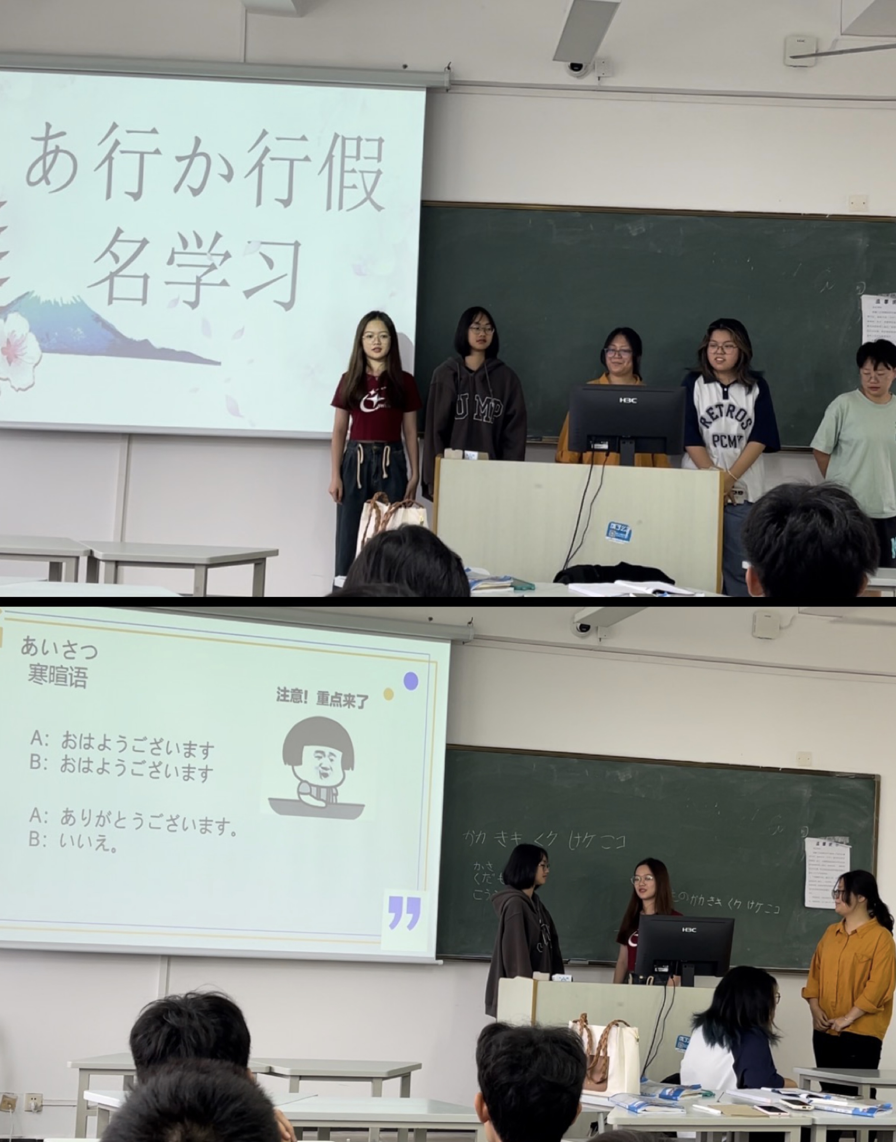 在这次的课堂发表中,我们小组对あ行、か行进行了讲解。在课堂上,主讲的同学组织同学们上台书写,还对あ、か行进行了应用组词。这次的发表不仅让我们记忆深刻的记住了它们的应用,还了解到了一些中日文化的不同,在茶道文化方面,日本人更注重礼仪,口味多偏向日本人喜爱的抹茶,中国的茶类较多,有不同的喝法与冲泡方式。这堂课上同学们都更好的参与了课堂,让我觉得课堂氛围更好了,同时,大家的日语口语能力也得到了锻炼。(冯蕊)