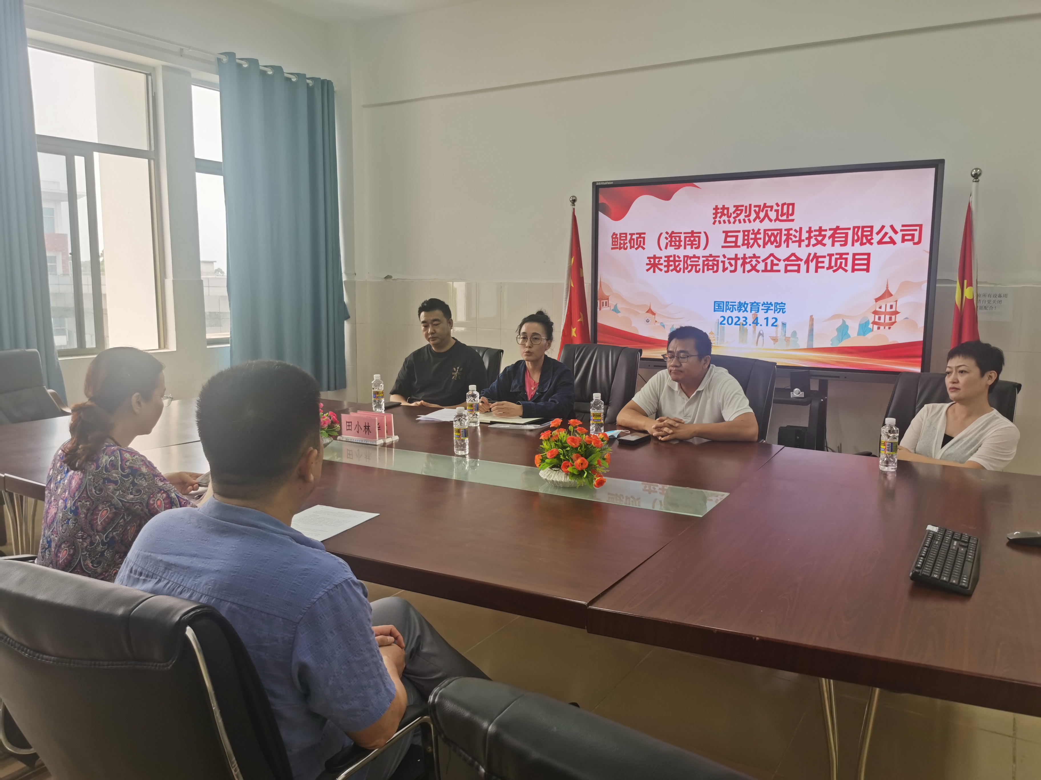 2023年4月12日,鲲硕(海南)互联网科技有限公司岳雪山总监一行4人前来我院进行座谈,就进一步深化校企合作,加强供需对接,整合优质就业资源,助力学生的高质量就业和人才培养高质量发展进行了商讨。座谈会上,国际教育学院韩大伟院长、刘莉副院长介绍了学校总体发展情况、国际教育学院人才培养情况以及毕业生就业工作等,学院将积极促进人才培养与企业用人需求精准对接,实现毕业生更加充分、更高质量就业创业,更好地服务地方经济社会高质量发展。 企业负责人分别围绕企业发展情况、人才需求、校企协作等进行了交流发言,对学校人才培养质量和毕业生职业能力给予高度评价。校企双方在教学实践、实习实训、就业对接等方面达成进一步合作共识。