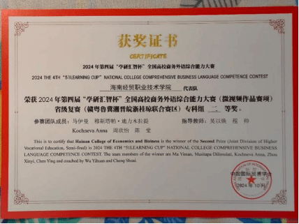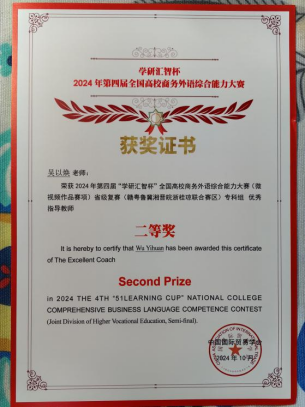2024年10月,经过近四个月的校赛、省赛角逐,我院代表队(指导老师:吴以焕、程帅;参赛团队成员:马伊曼、穆斯塔帕·迪力木拉提、Kochneva Anna、周欣怡、陈莹)在2024年第四届“学研汇智杯”全国高校商务外语综合能力大赛(微视频作品赛项)省级复赛(赣粤鲁冀湘晋皖浙桂琼联合赛区)中荣获专科组二等奖。指导老师吴以焕荣获“优秀指导老师”称号。