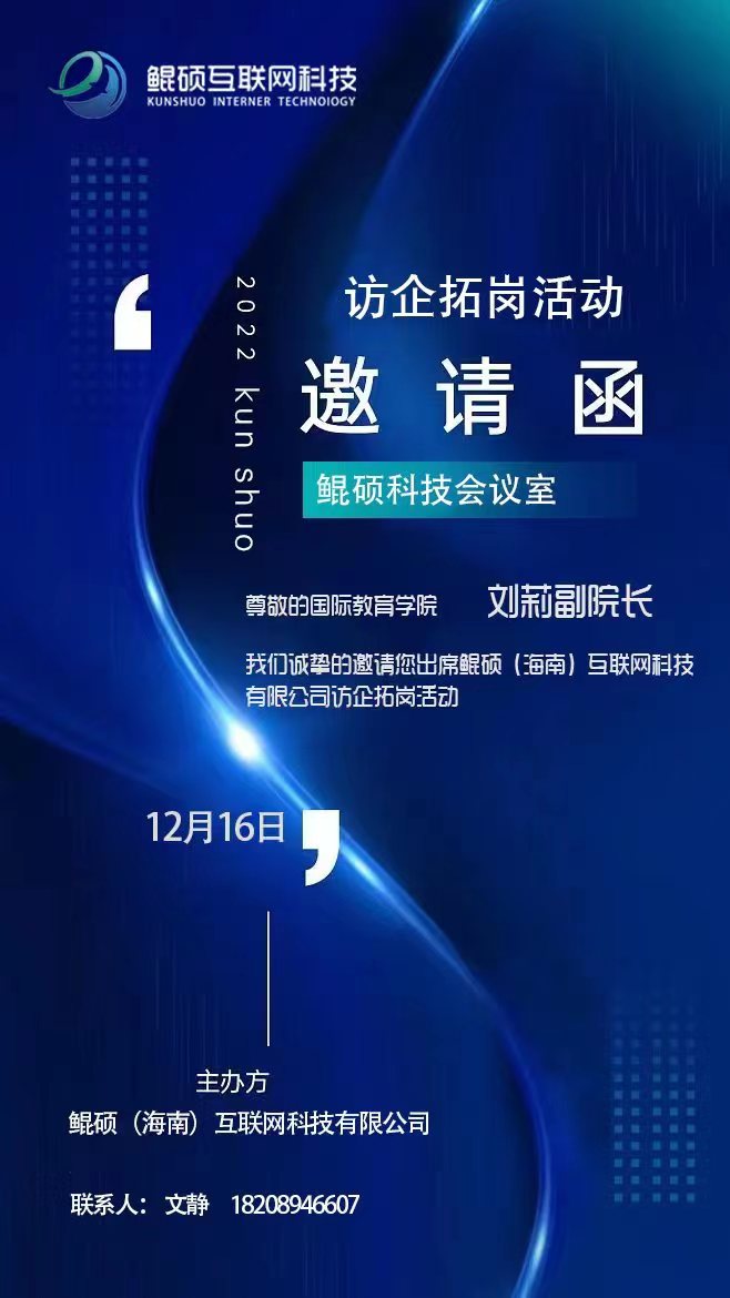 为了拓宽学生的就业渠道,增加学生的就业机会,让学生和企业近距高接触,2022年12月16日,国际教育学院刘莉副院长带领各专业负责人及专业骨干教师一行5人前往鲲硕(海南)互联网科技有限公司进行访企拓岗活动,与企业开展校内外实践基地建设等内容进行研讨,为开展更深层校企产教融合合作奠定基础。
