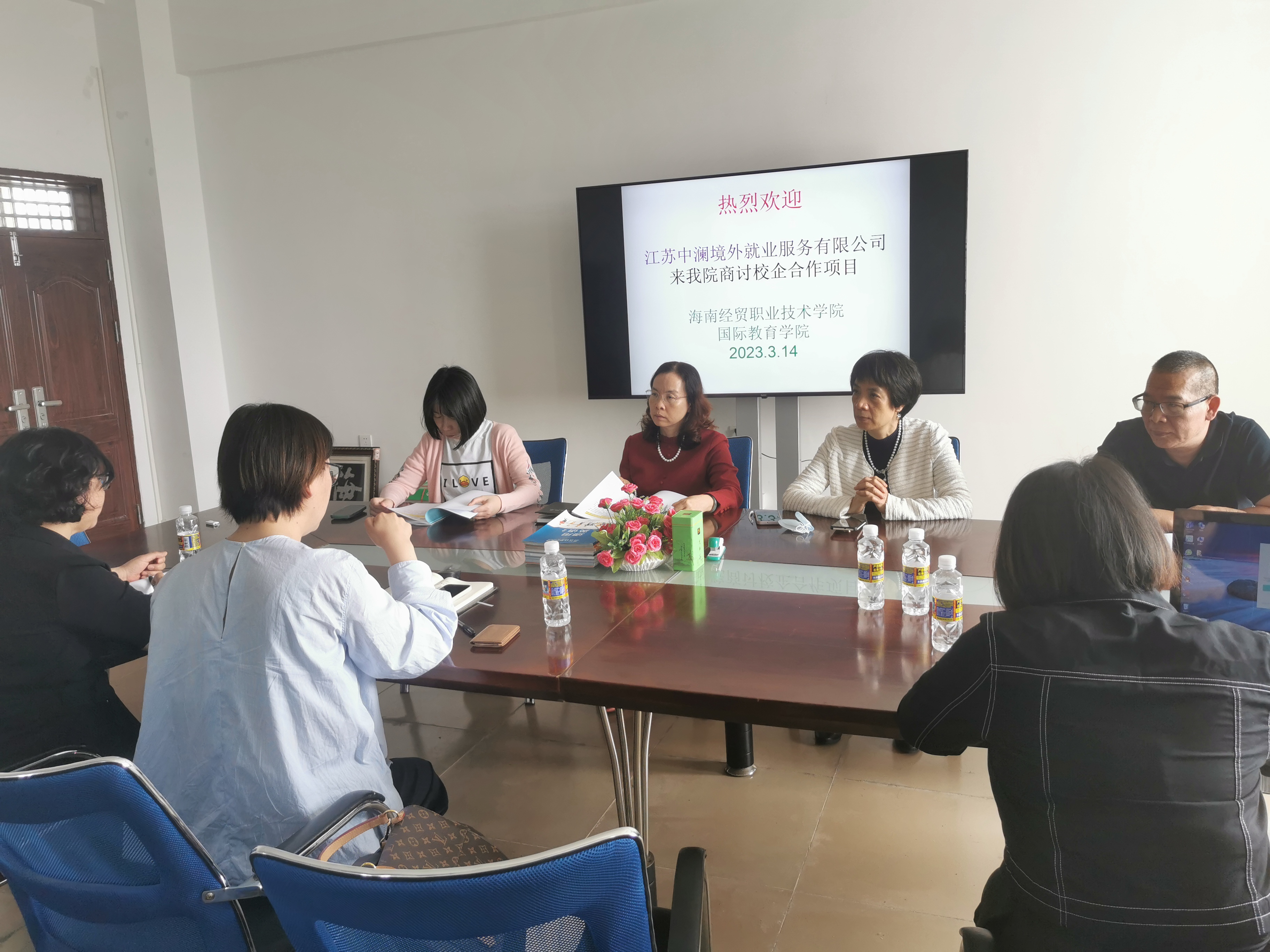 为推动产学研协同创新,寻求校企合作共赢、共谋发展的良好局面,2023年3月14日下午,江苏中澜境外就业服务有限公司徐丽经理、校企项目部经理徐群、高茜玲等一行应邀莅临我校国际教育学院座谈校企合作。国际教育学院刘莉副院长、郑艳副书记、学工办黄银亮老师、应用日语专业负责人王耀义老师和商务英语专业负责人黄桂凤老师参加了座谈会。