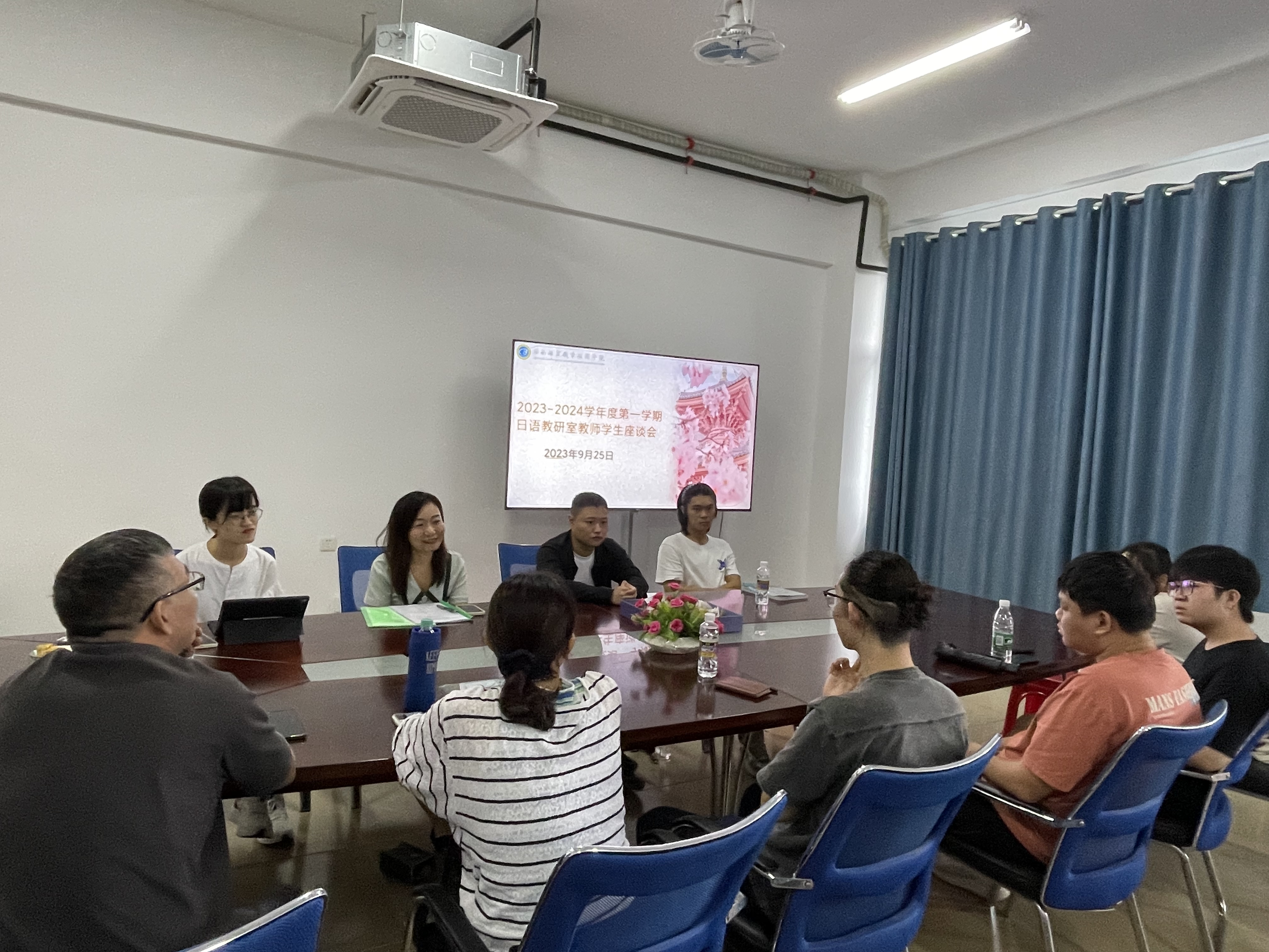 为了更好地贯彻“以生为本”的教育思想,多方面了解学生的学生的学习状况和思想动态,提升应用日语专业教学水平,2023年9月25日中午,应用日语教研室召开例行教学研讨会。会议以教师学生座谈会的形式召开,邀请了22级学生王丽、周纳川、先远志、郭伟峰、李育帆、王路凯一起进行座谈,通过一对一回答的形式,全方位地倾听学生的心声。日语专业负责人王耀义老师主持了此次会议。