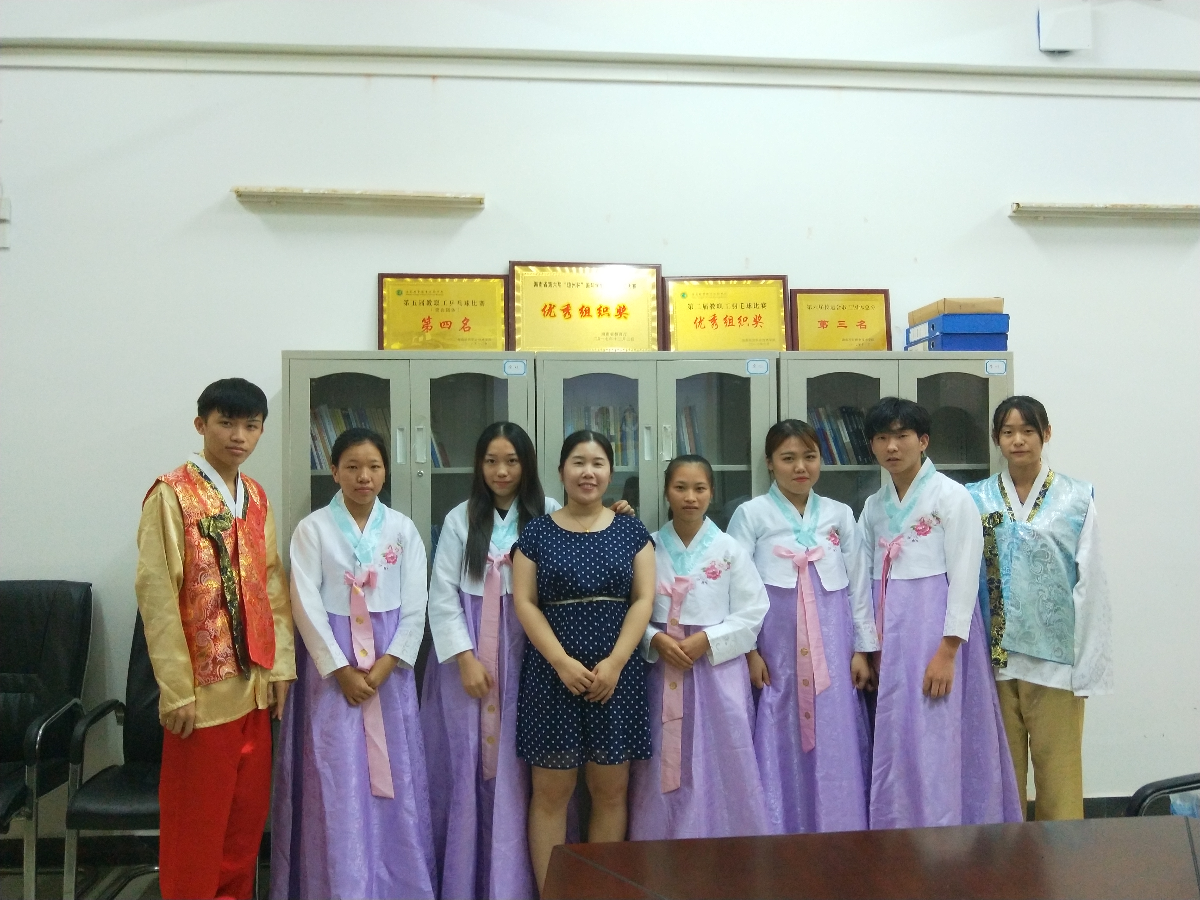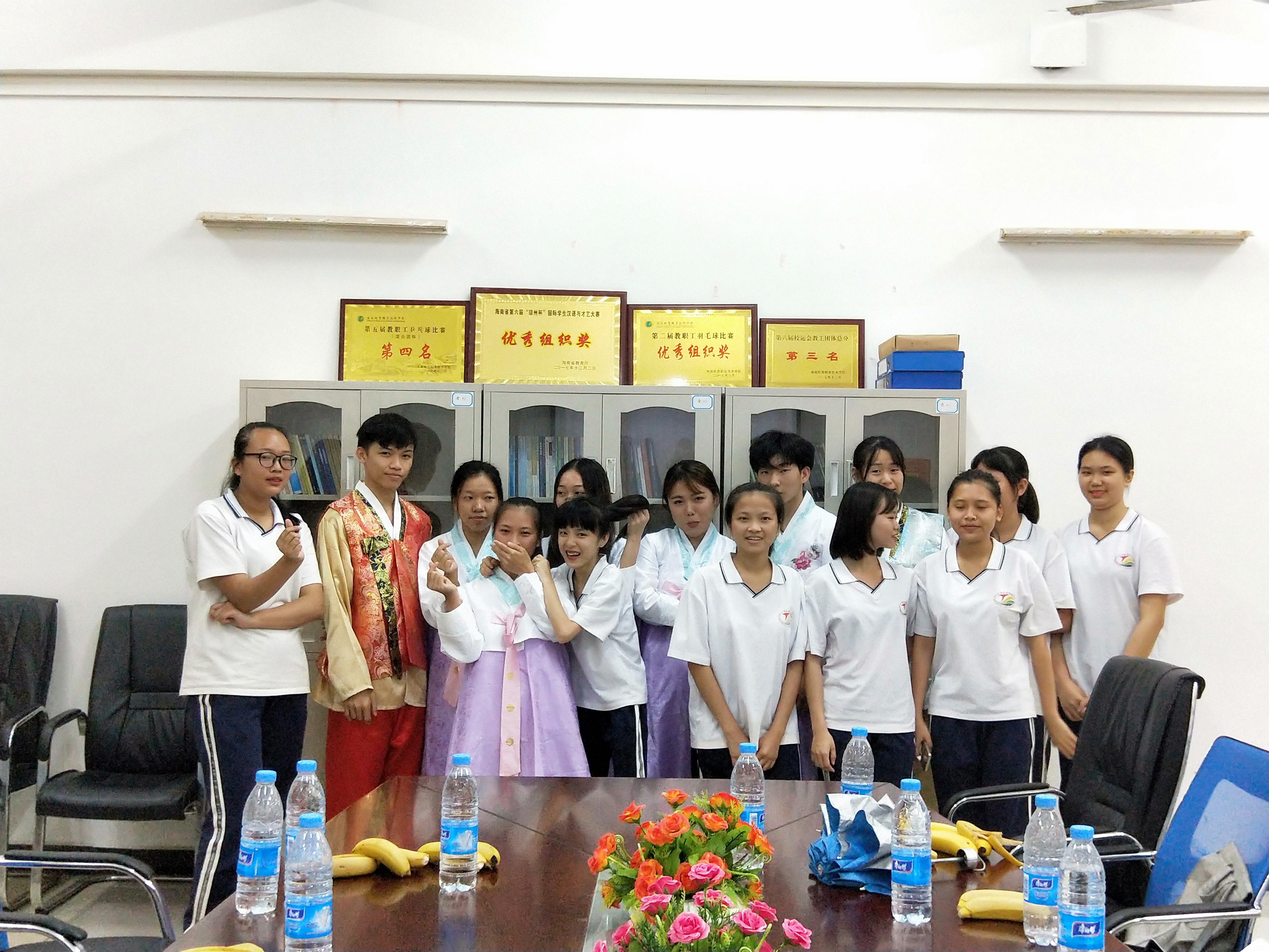 游览结束,学院组织安排韩语业的省旅校学生在会议室听取了国际教育学院副院长于勇老师及专业主任路冉老师对海经贸校园建设、专业特色、出国留学、校企合作、就业创业等方面的情况介绍,及韩语专业优秀学生的学习经验及体会,期间自由交流时间省旅游学校学生积极提问,气氛活跃。最后省旅校学生亲自试穿了传统韩服,参观夜市小吃街,志愿者为全体同学拍摄集体合影,为此行留下了美好的记忆。