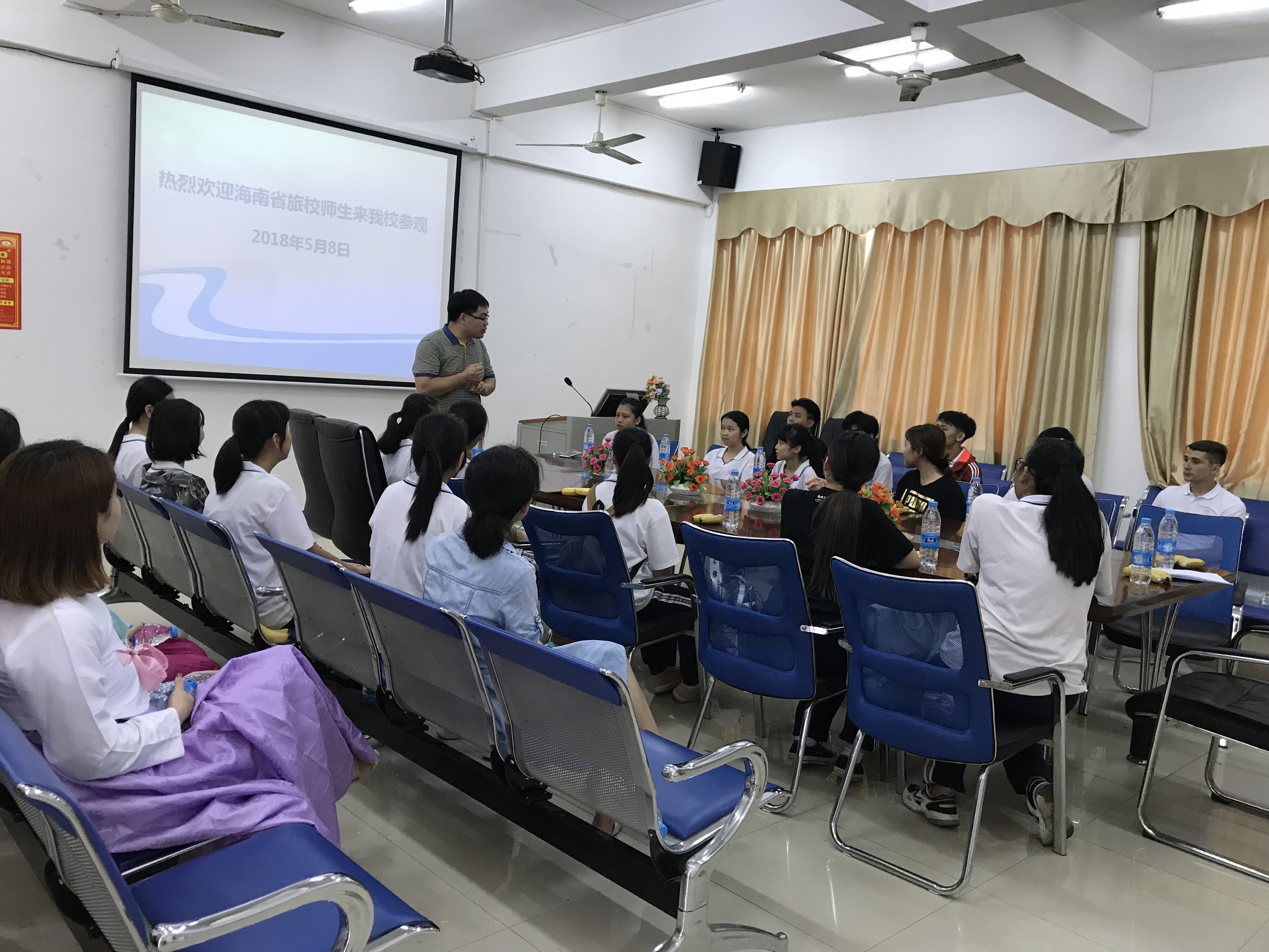 本校5月11日讯(国际教育学院报道)5月8日及5月10日是2018年海南职业教育活动周校园开放日,beat365国际教育学院迎来了海南省旅游学校、海口旅游职业学校2所中职院校60余名师生到校参观交流。5月8日下午两点半整,在韩语专业主任路冉以及学生志愿者的带领下,海南省旅游学校师生乘车游览了经贸校园,从学校正门出发,游览了学术交流中心、教学楼、实训楼、百果园、体育馆、学生宿舍等等。