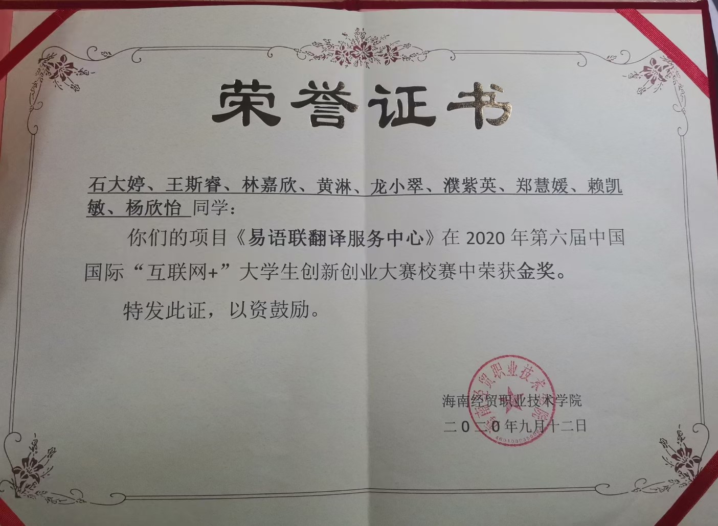 18级学生王斯睿、杨欣怡同学,共同组队申报的项目——“易语联翻译服务中心”在2020年第六届中国国际“互联网+”大学生创新创业大赛校赛中荣获金奖。