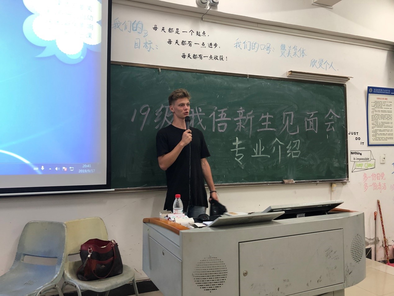 19级新生代表发言,表明自己的志向以及对俄语的期待,分享自己学习俄语的方法与心得。