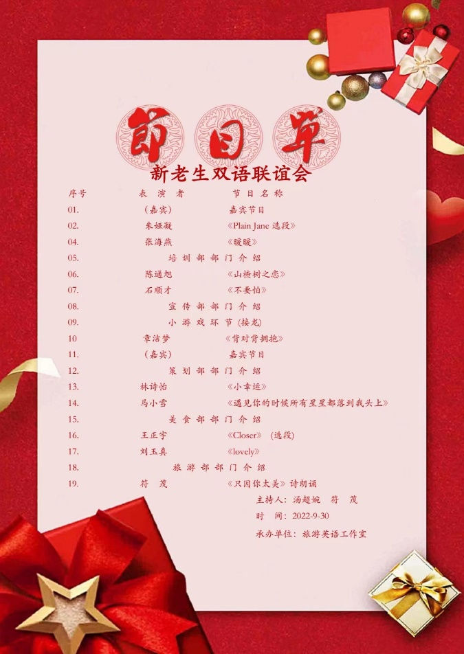 (22旅英1班朱娅凝报道)挥别夏的热浪,触摸秋的微风。为了帮助新生们更快地破冰与融入,展示青春风采,同时也为了迎接祖国73周岁华诞,同学们热情高涨、翘首以盼。终于,在9月30晚上,国庆前夕,旅英专业正式举行了新老生双语联谊会!出席本次活动的有旅英专业的各位老师,以及本专业21级和22级的全体同学。活动由21级汤超婉同学和22级符茂同学共同主持。