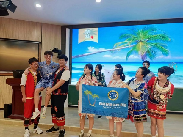 Movement, which is filled with patriotic enthusiasm , is rather impressive and shocking. This is an exhibition with fluent English introduction to Hainan amorous feelings, rich study trips and creative Tourism English theme design. While demonstrating students' solid language skills, they also fulfill their mission of singing Hainan folk songs, telling Hainan stories and spreading Chinese culture.
