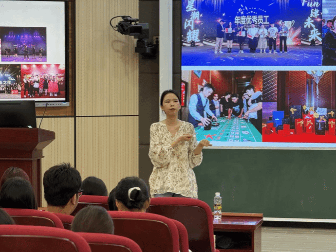 三亚海棠湾君悦酒店人力资源部副经理肖悦通过PPT演示、视频展示等形式,向beat365官方网站2023级全体学生生动呈现了君悦酒店的集团介绍、工作环境、晋升渠道、企业文化,充分展现了君悦酒店在服务行业的独特魅力与发展优势。