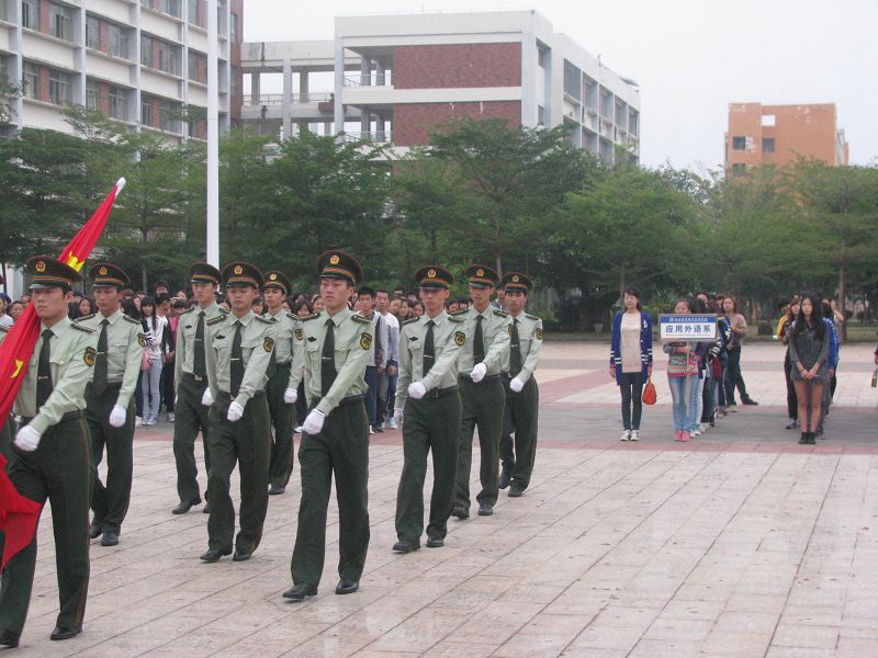 2013年11月18日清晨7点,应用外语系在经贸广场庄严而隆重地举行了升国旗仪式。迎着灿烂的朝阳,在激昂的伴奏声中,由10名学院国旗班成员组成的护旗方队,迈着整齐的步伐,护送着鲜艳的五星红旗行进至升旗台。伴着庄严雄壮的国歌声,五星红旗冉冉升起、迎风飘扬,应用外语系12、13级全体学生目视国旗行注目礼。