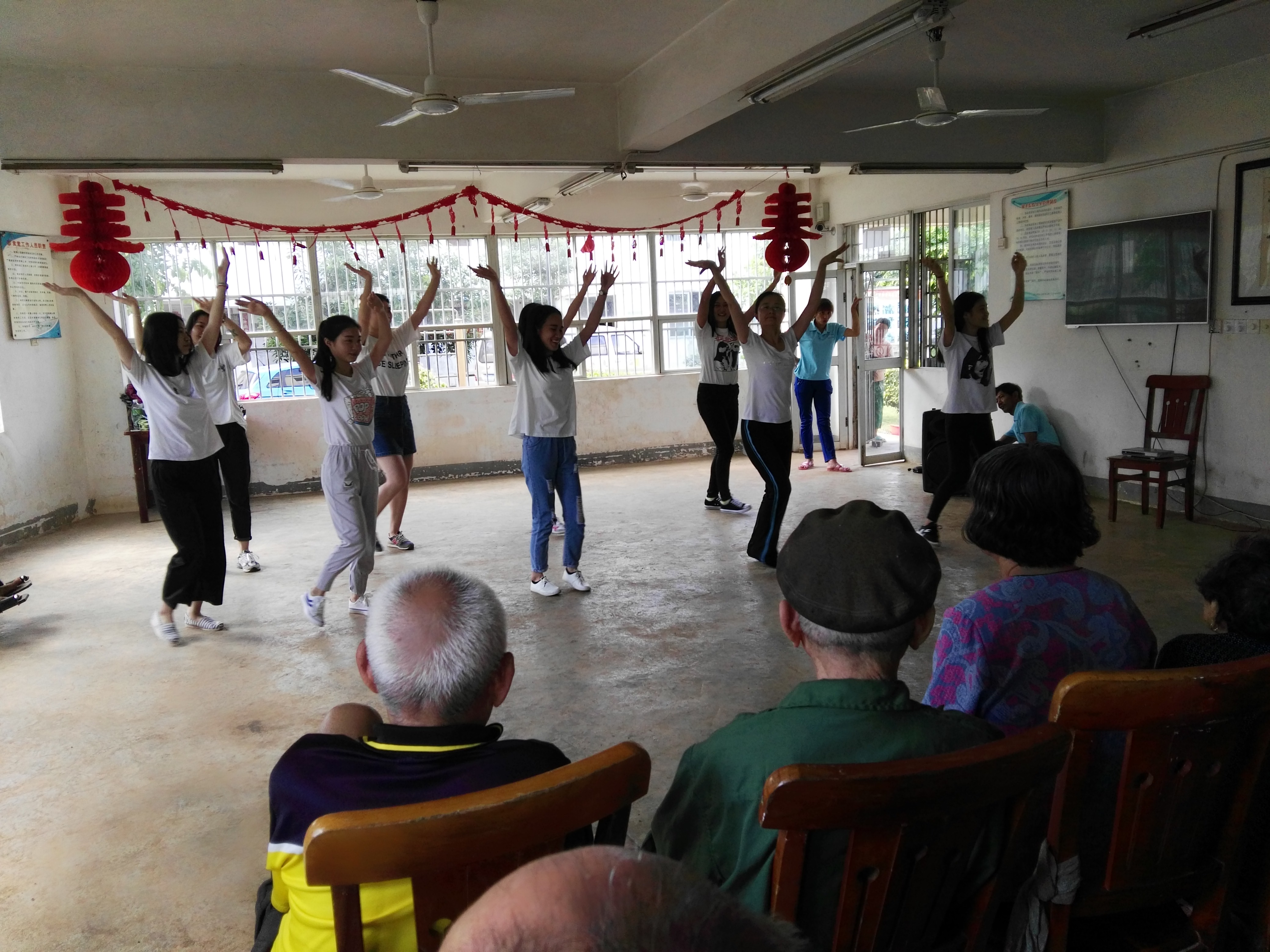 接下来的活动更是高潮迭起,各种各样的文艺节目陆续闪亮登场。首先是我们与何老师一起为他们带来的集体舞“大海航行靠舵手”。他们看到我们虎虎生威的矫健动作,老人们乐开了怀,手也不自觉地舞动;他们听到熟悉动听的旋律更是拍手叫好,有的放开了嗓音为我们伴舞,也许是经典红歌勾起了他们年轻时的美好回忆。