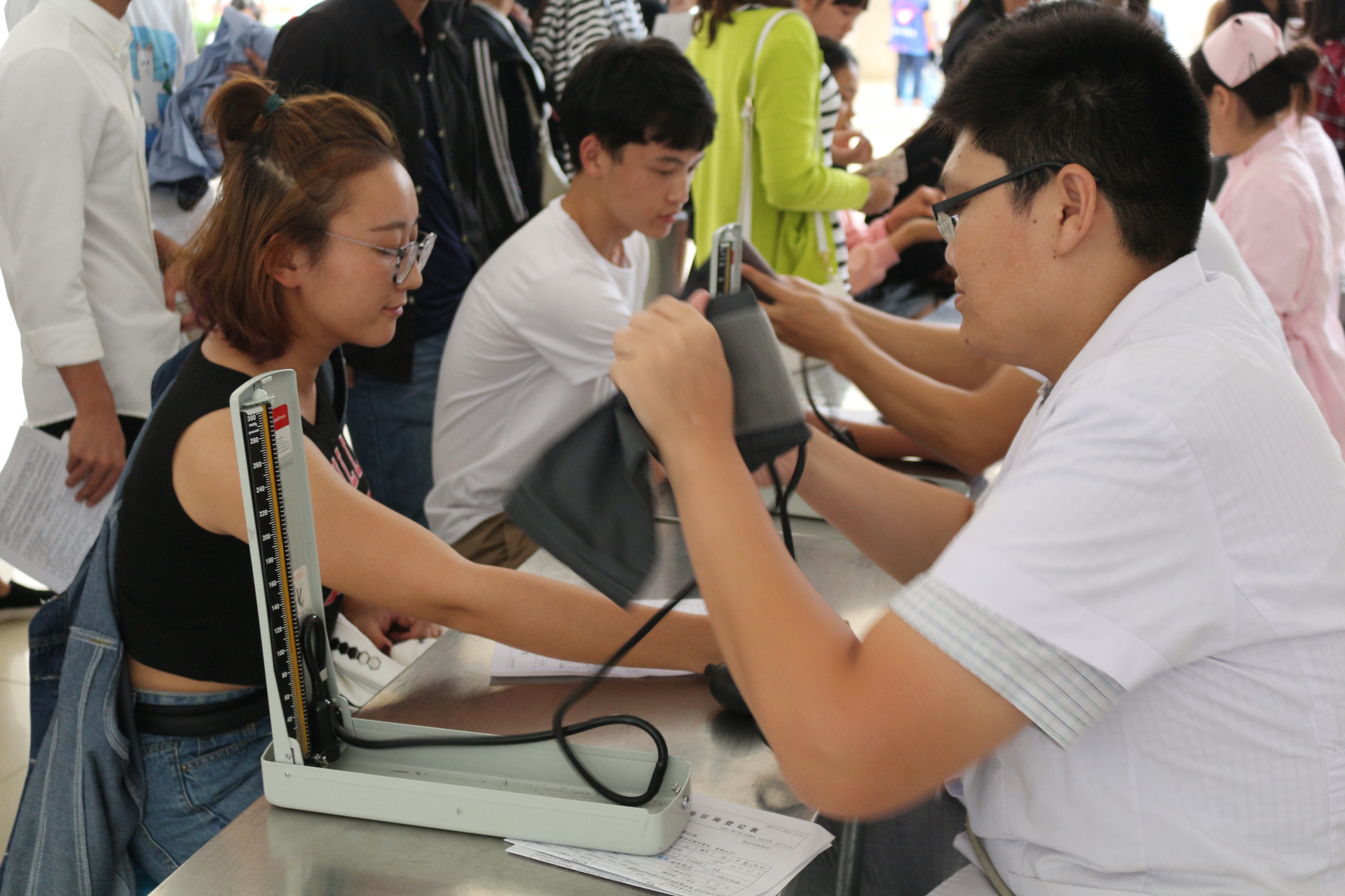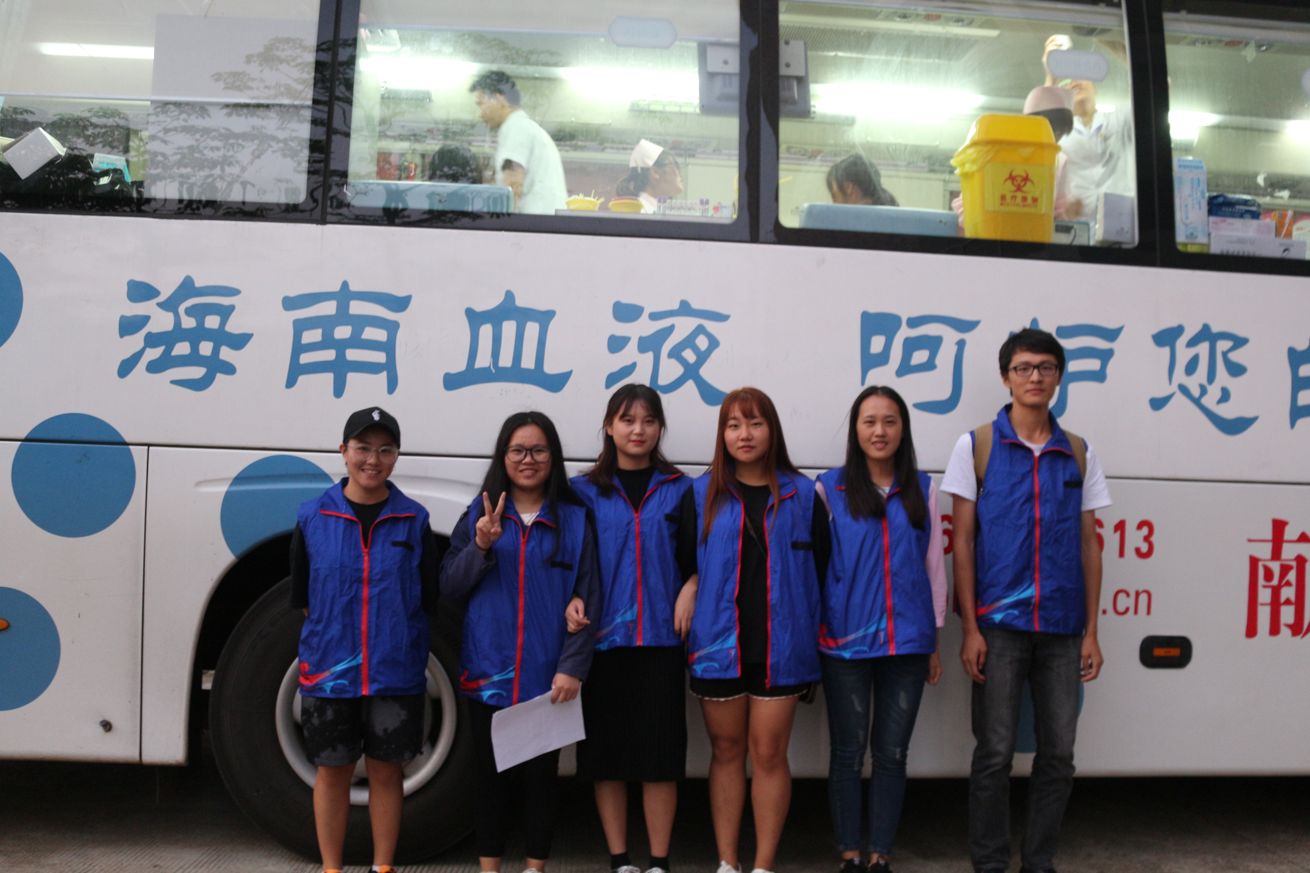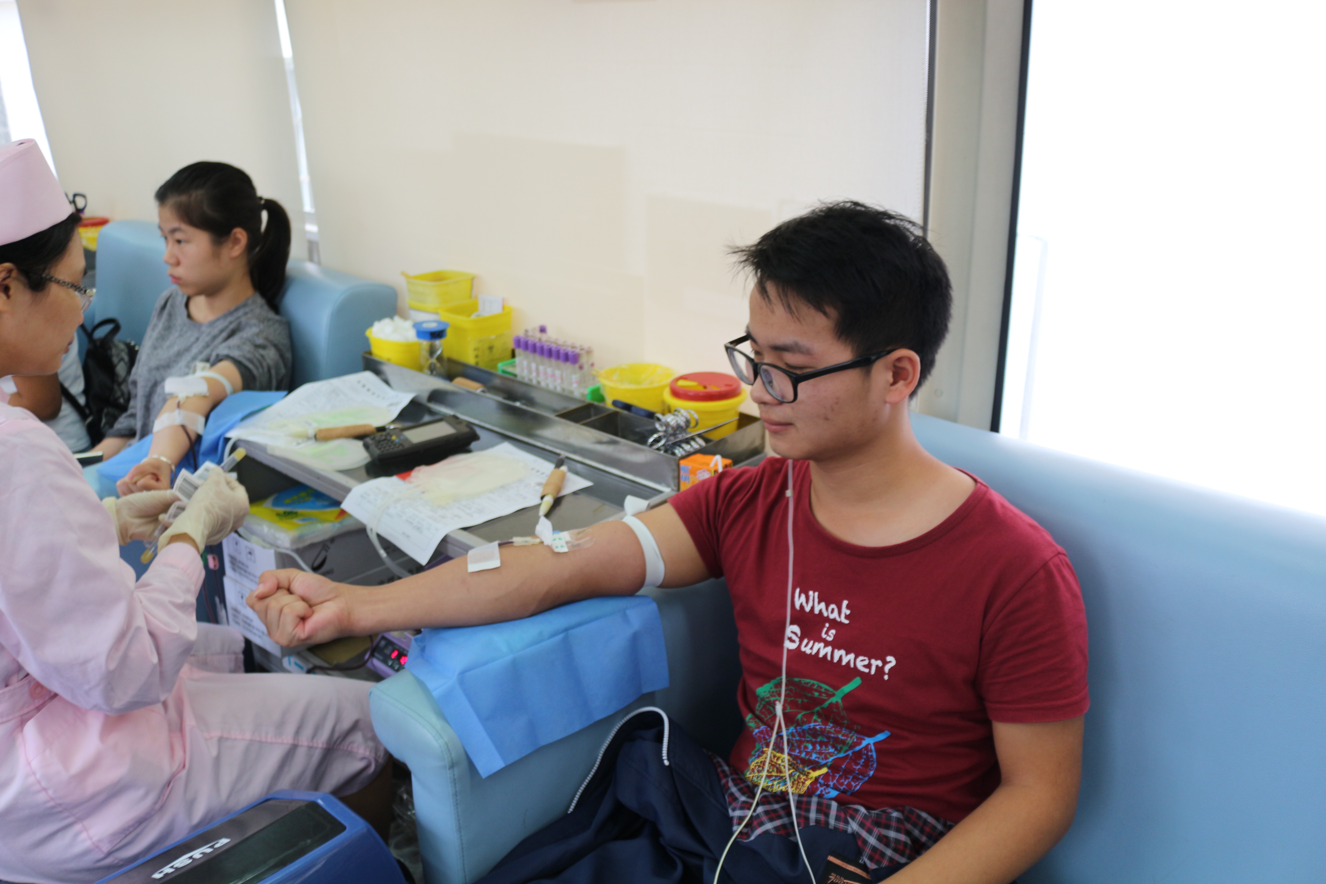 我院青年志愿者协会的同学提前布置好献血点,一辆献血车缓缓驶入校园。自愿参加无偿献血活动的同学陆续来到献血车旁,排好长队,在工作人员的引导下,积极配合,严格遵守献血秩序,认真完成填表、体检、献血、抽血等程序。