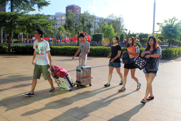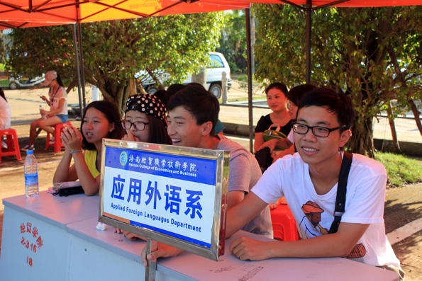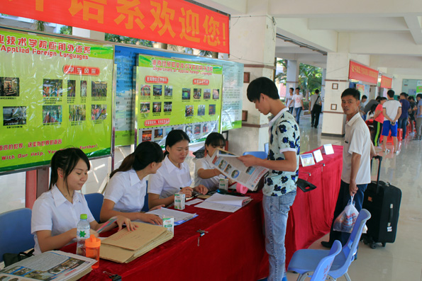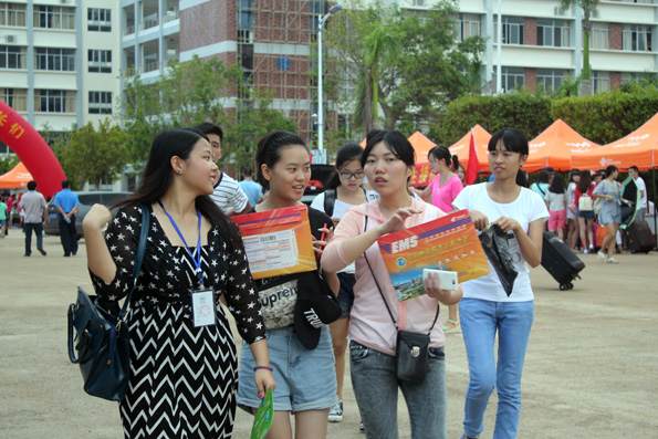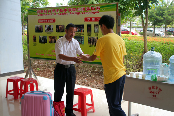 (应用外语系 周艳芳报道)当硕果缀满枝头,当枫叶变黄的时候,又是一届高三学子摆脱学习的重担,迎来自己轻松自由的大学生活……9月6日beat365的校园里,你虽看不到金色的枫叶,你却能看到一张张灿烂的笑脸。海南的季节是没有春夏秋冬之分的,9月的海南虽也进入了秋季,但这里仍然充满了火辣辣的热情。一大早,烈日就当空照,而烈日下有这样一群孩子,他们右手拉着行李,左手提着桶,正在给旁边一脸迷茫的同学讲解的就是应用外语系奔走在前线的同学们,尽管他们都已经满头大汗,但仍热情,耐心的为同学们拿东西,带路,指引他们报道,注册!而有这样一群人们,他们从早上7点就集合,没吃早餐,忍着肚子“咕咕”的抗议就坚守在自己的岗位上,他们认真的为同学们核对录取通知书,办理登记手续,耐心的告诉他们接下来该做的事,他们的工作虽不在烈日下,却也同样的辛苦,同样的付出了汗水。他们就是应用外语系登记处的同学,他们的细心耐心为同学们解答了很多疑问,也让新生们知道接下来该怎么做,缩短了同学们报道的时间!而还有这样一群人们,他们看起来更加成熟,稳重,他们坐在桌子旁边,偶尔指导一下登记处的同学们,当有家长或同学不懂的时候,他们也主动为他们讲解。他们,就是应用外语系的老师们,他们的付出同学看在眼里,记在心里!中午十分,太阳公公兴许是不忍心看到同学们这么辛苦,于是,倾盆大雨哗啦啦下来了,这可苦了在前线接新生的孩子们,只看他们在转瞬之间全身湿透,但是他们却没有因为自己被淋而丢下了新生及家长,相反的他们尽可能的把伞给新生而自己却冒雨穿行,他们的付出让我们感动。登记处则又是另一番景象,外语系学生会干部不顾大雨,奋力清扫被雨打湿的地方,只为了让新生及家长们有一个干净整洁的地方,而此时外语系朱琳书记及其他领导,老师也都不畏风雨,纷纷前来慰问同学们。外语系老师同学的热情和付出感动着全场所有的人们,也让同学们第一次就深深爱上了应用外语系这个大家庭。迎接新生一事一直忙到下午6点多,同学们在撤离场地时还不忘清理好垃圾带。之后,才带我疲倦的步伐走向了食堂......