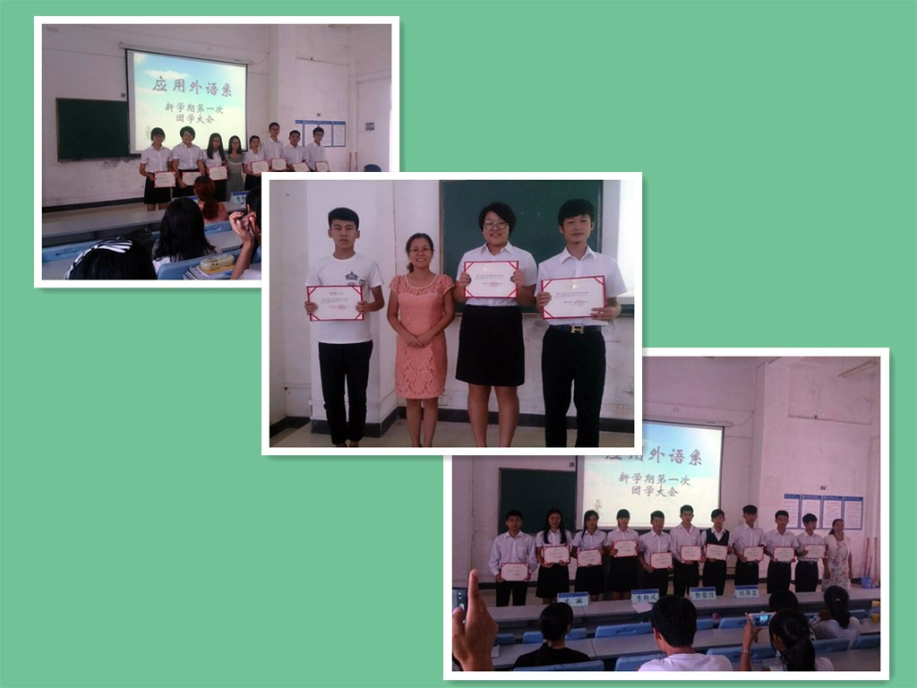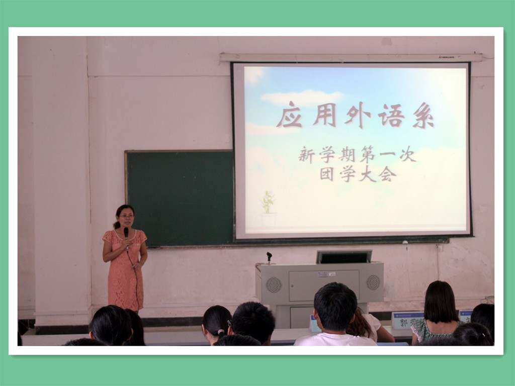 2014年10月17日中午12点,beat365应用外语系在教学楼1--103隆重举行了“应用外语系新学期首次团学大会”,出席本次大会的有应用外语系党总支书记朱琳,系团总支书记郭蓉佳,系就业干事李转风,系实习辅导员刘羿显,以及团总支学生会各部门的学生干部。