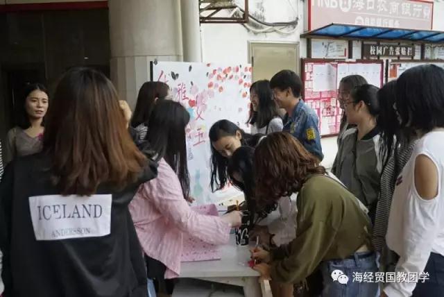3月7日,为丰富女生们文化内涵、思想素质、完美情操,培养优雅气质。国际教育学院在食堂门口进行了以“优雅女王”为主题的女生节心愿活动。史付田辅导员组织,团总支学生会参加实行。 细雨蒙蒙,丝丝微风,这样的意境正适合女生们唯美朦胧的气质。经团学成员精心布置过的板报,分外新颖,吸引各个学院的女生观光与积极参与写心愿。板报被特色包围着,板报右侧是一个清新的女孩,头顶布满玫瑰花瓣,身裙被印满口红印,充满了少女情愫,左侧主要是心愿墙,并有漂亮的衣裙剪纸,还原了女生们的公主梦。更加突出了“优雅女王”的主题。心愿墙上心愿丰富,让人记忆犹新的是几个写想得到一本书的同学,比如:《世界上的另一个你》、《好久不见》、《目送》、《好吗好的》、《以最好的样子遇见你》等。这些心愿充满了浓浓的文艺范,让书香飘香校园。