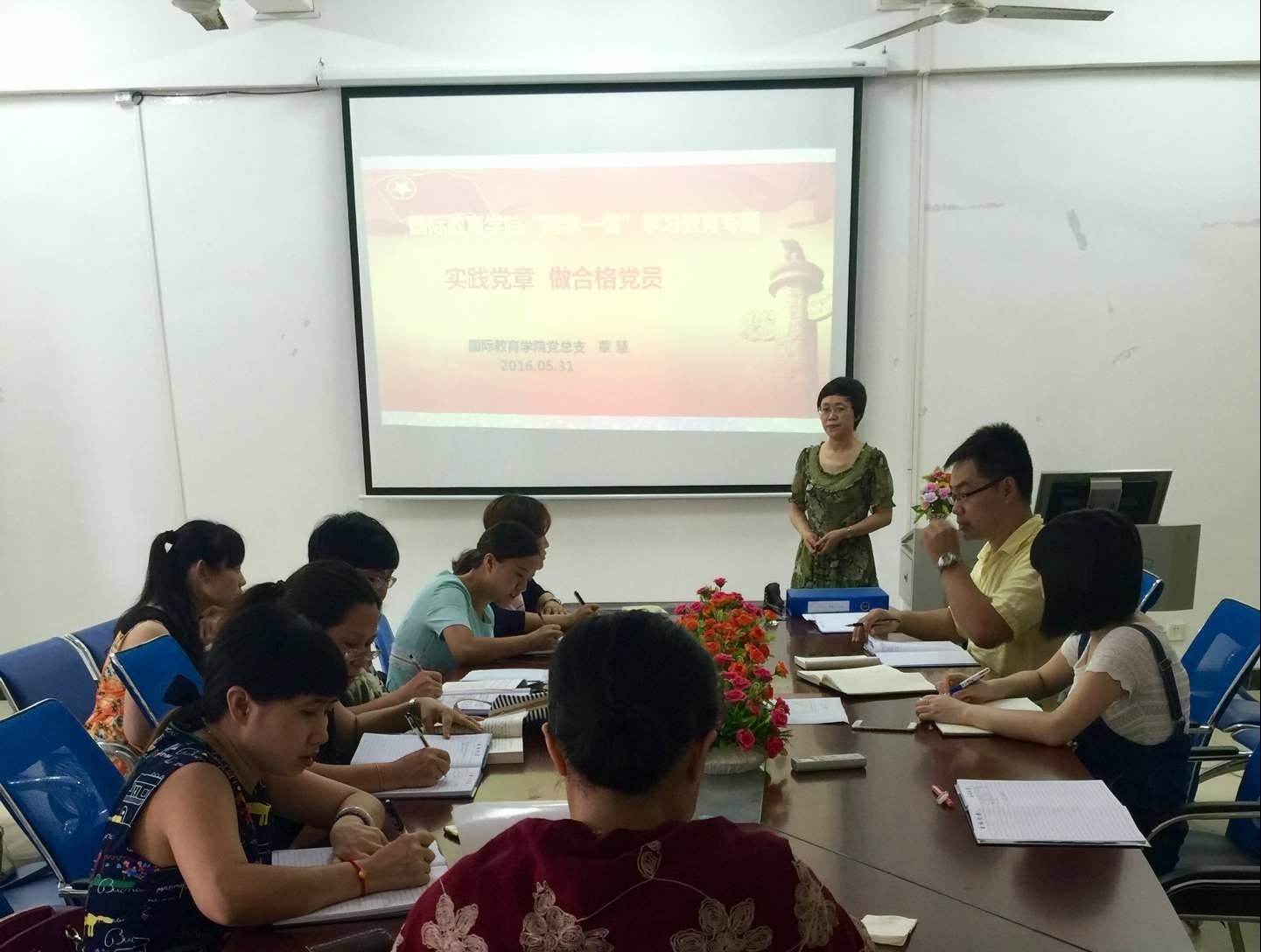(国际教育学院 报道)5月31日下午,国际教育学院党总支以“实践党章 做合格党员”为主题,为全体党员作党课专题讲座,采取以讲促学的方式,努力在“学”这个基础上下功夫,全面深化“两学一做”学习教育。