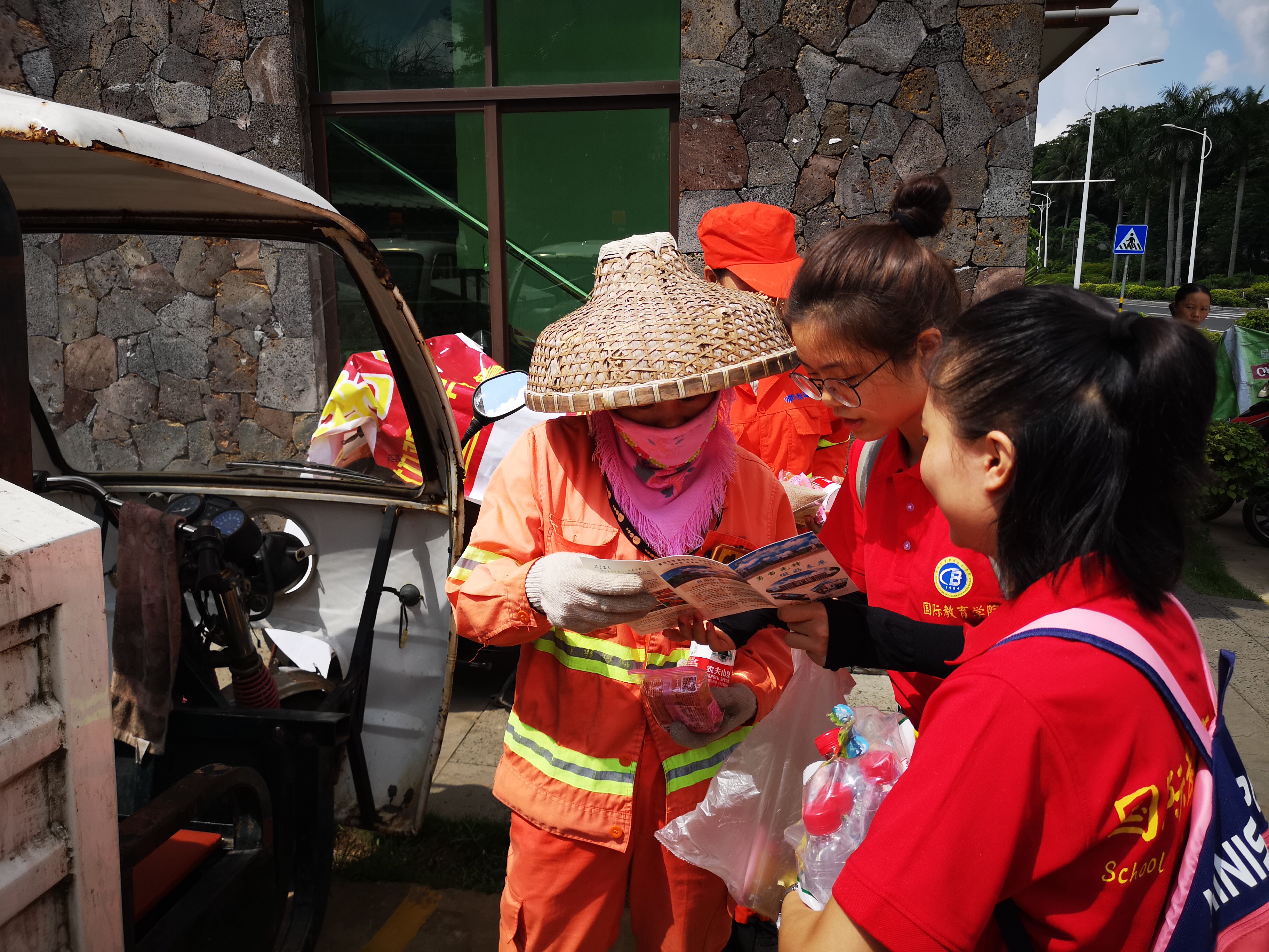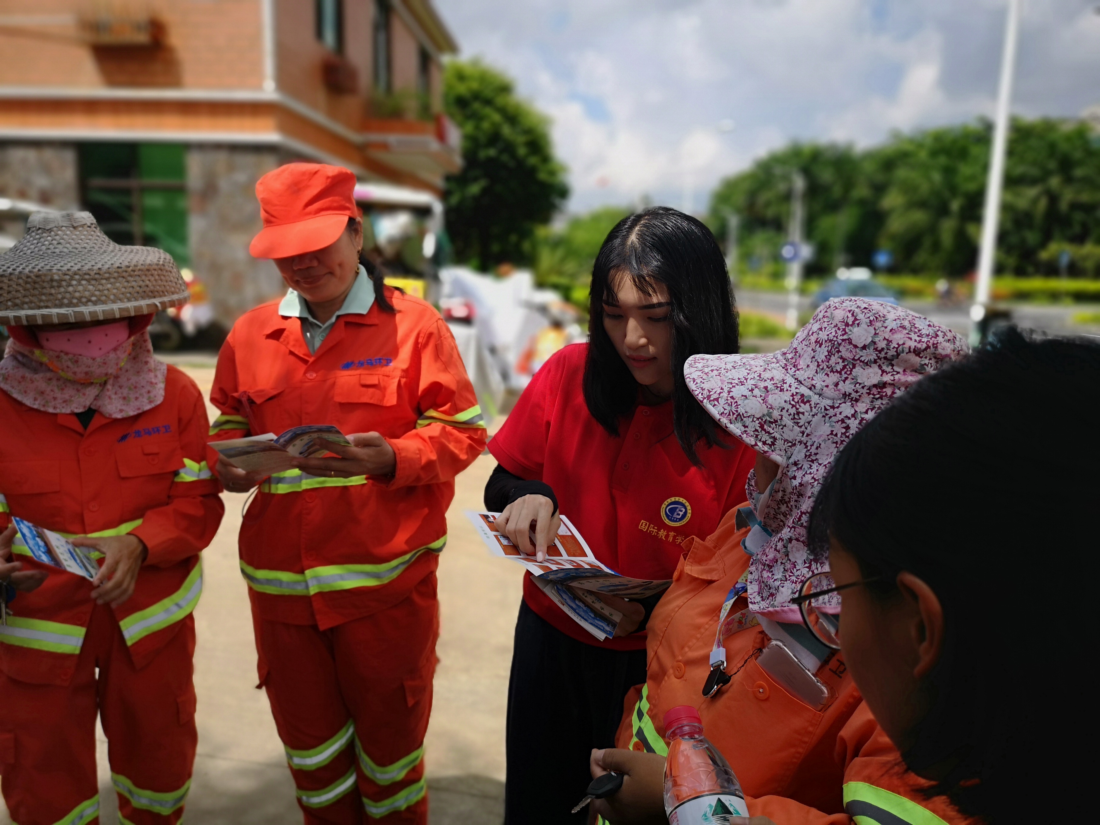 在建设海南自由贸易试验区和中国特色自由贸易港实践中,环卫工人为了城市的干净整洁,节假日也不休息,顶着炎炎烈日,用汗水擦亮城市,默默无闻地立足自己岗位,做着平常而又不平凡的工作。为了表达对环卫工人的敬意,并献上节日的祝福,学生党员们向每位环卫工人送上精心准备的宣传手册、月饼和矿泉水。