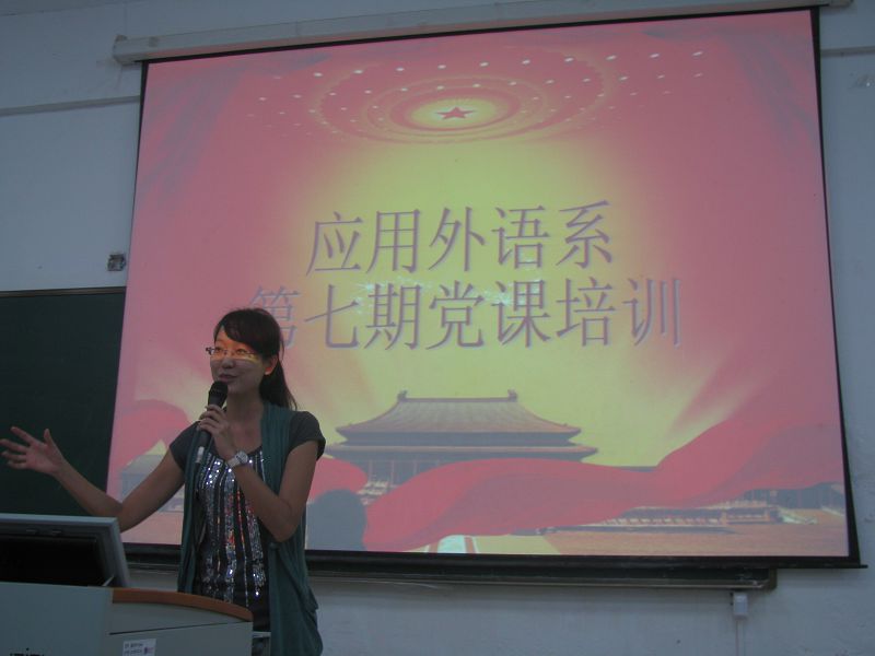 (应用外语系 李莹报道)中国共产党是中华人民共和国的先锋队,代表中国最广大人民的根本利益。2013年10月21日星期一晚,应用外语系在1-103召开了本期第二次党课培训。本次党课由学生党支部组织兼纪检委员代晓明老师主讲。