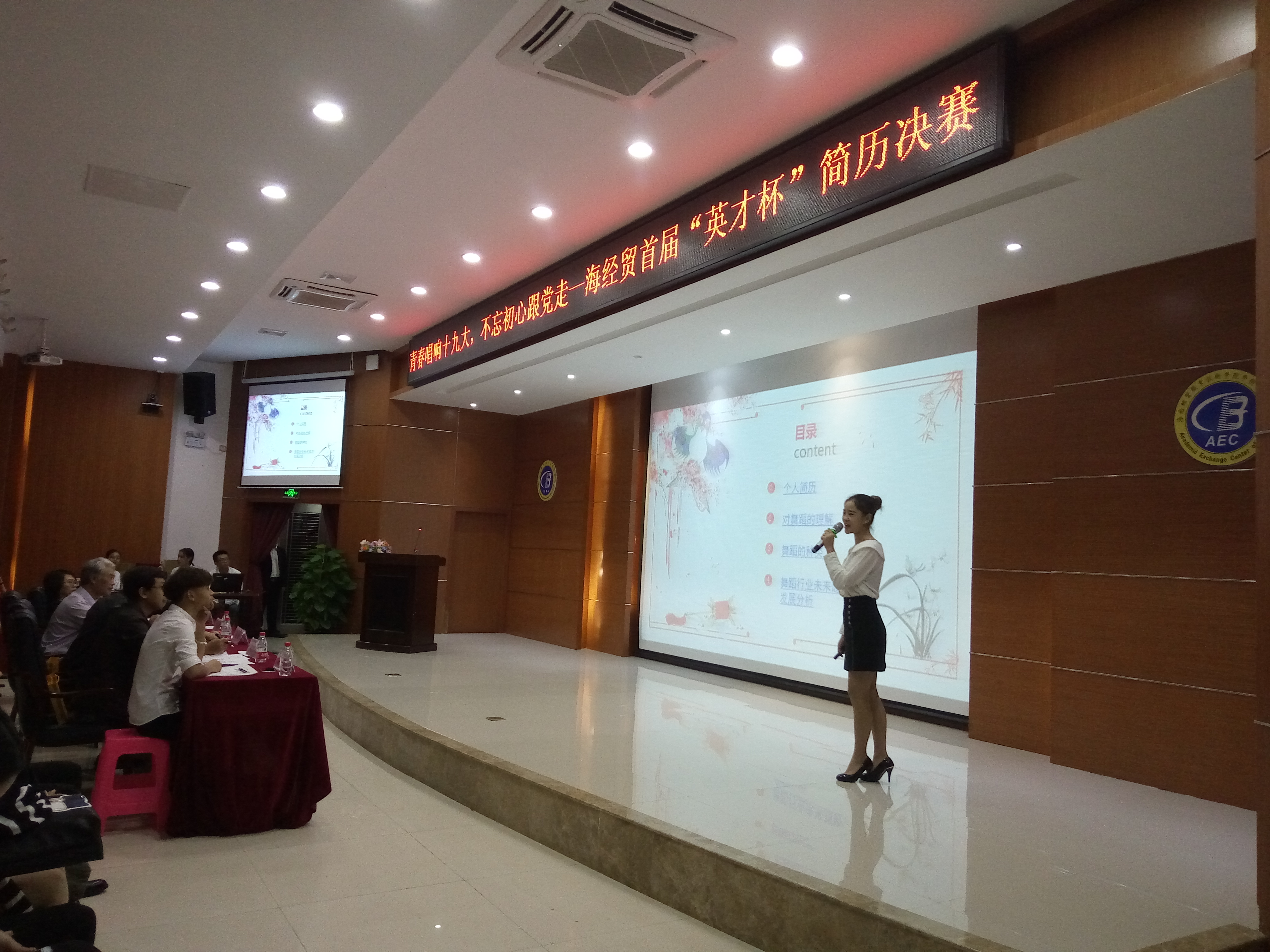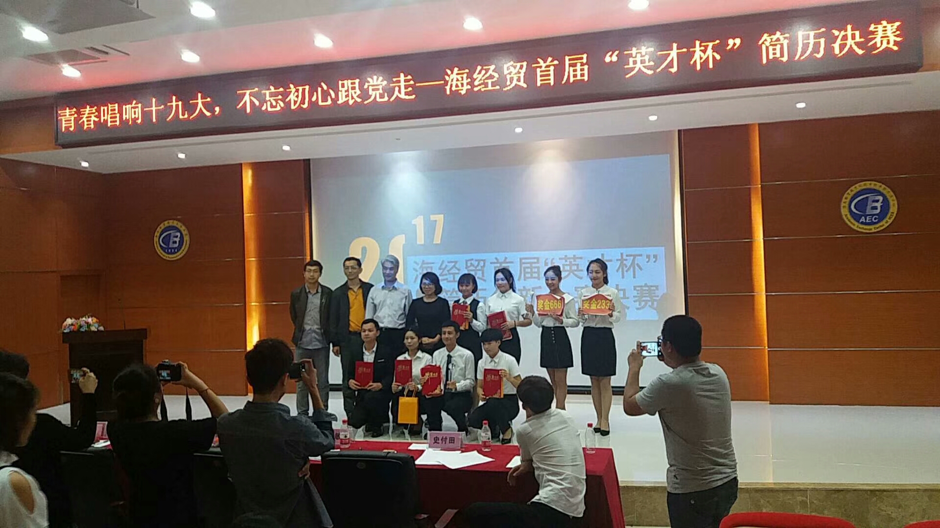 为了深入学习十九大精神,响应习近平总书记提出的“坚持就业优先战略和积极就业政策,实现更高质量和更充分就业”号召。2017年11月6日晚,由beat365主办、国际教育学院团总支承办的“2017海经贸首届“英才杯”创新简历大赛决赛”于经贸宾馆学术报告中心举行。