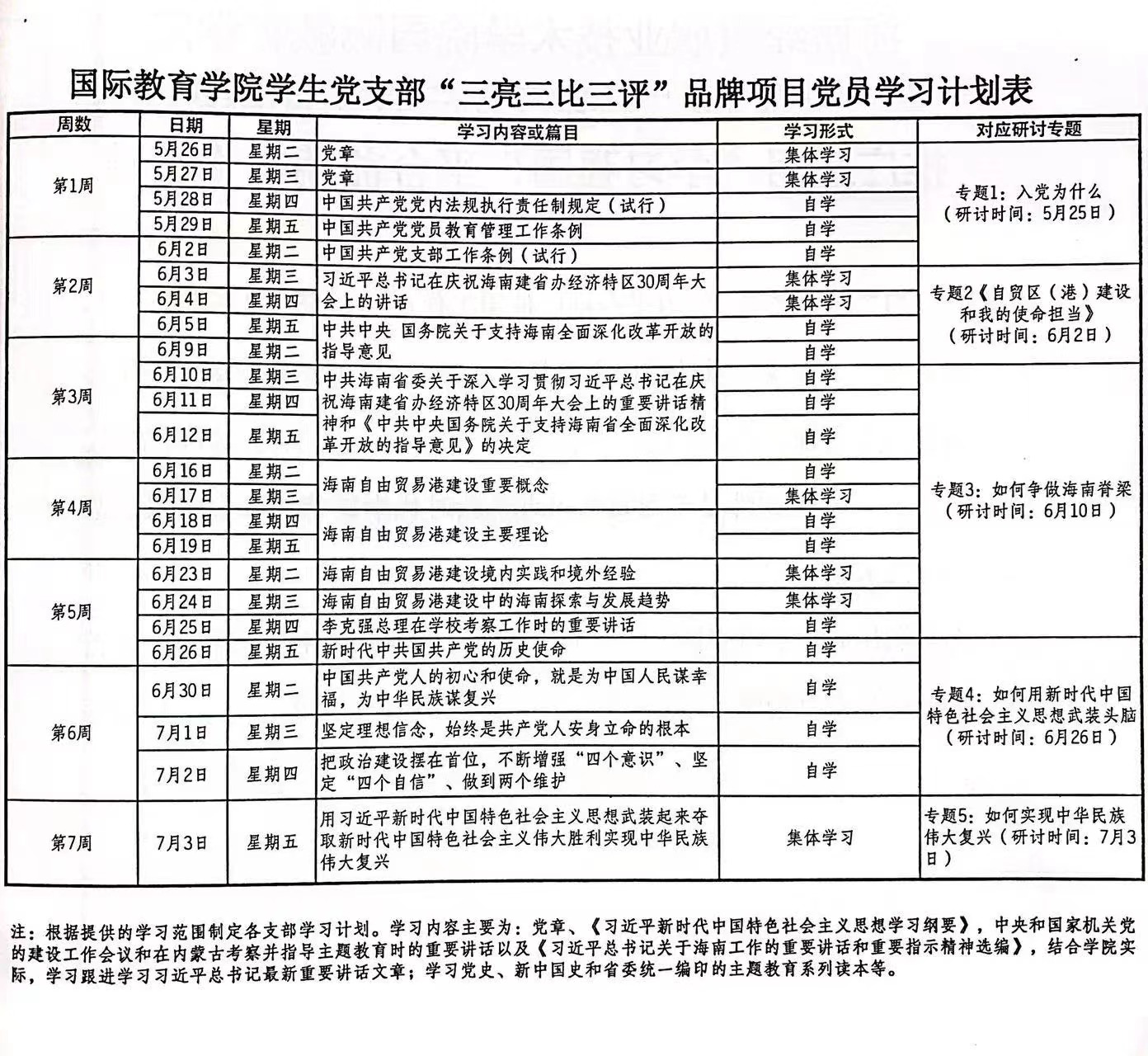 国际教育学院学生党支部“三亮三比三评”品牌项目党员学习计划表