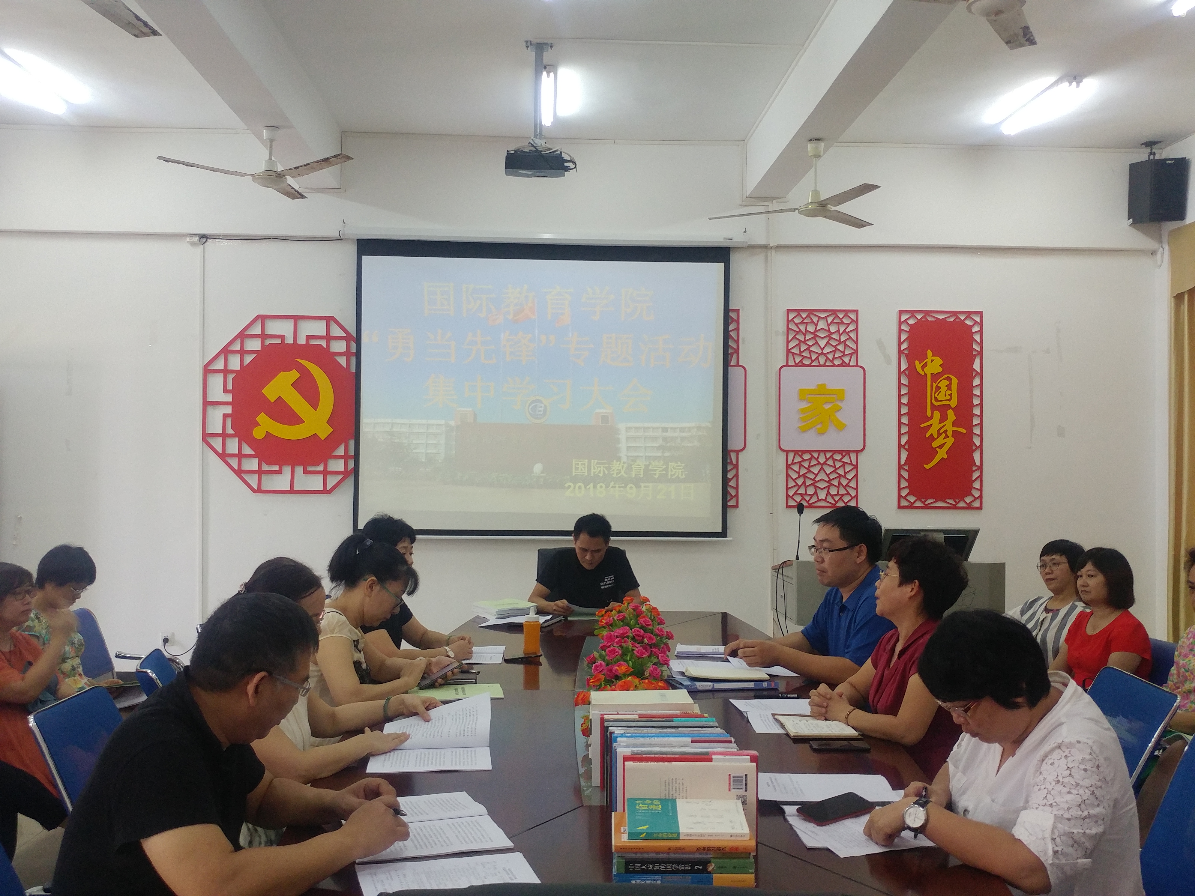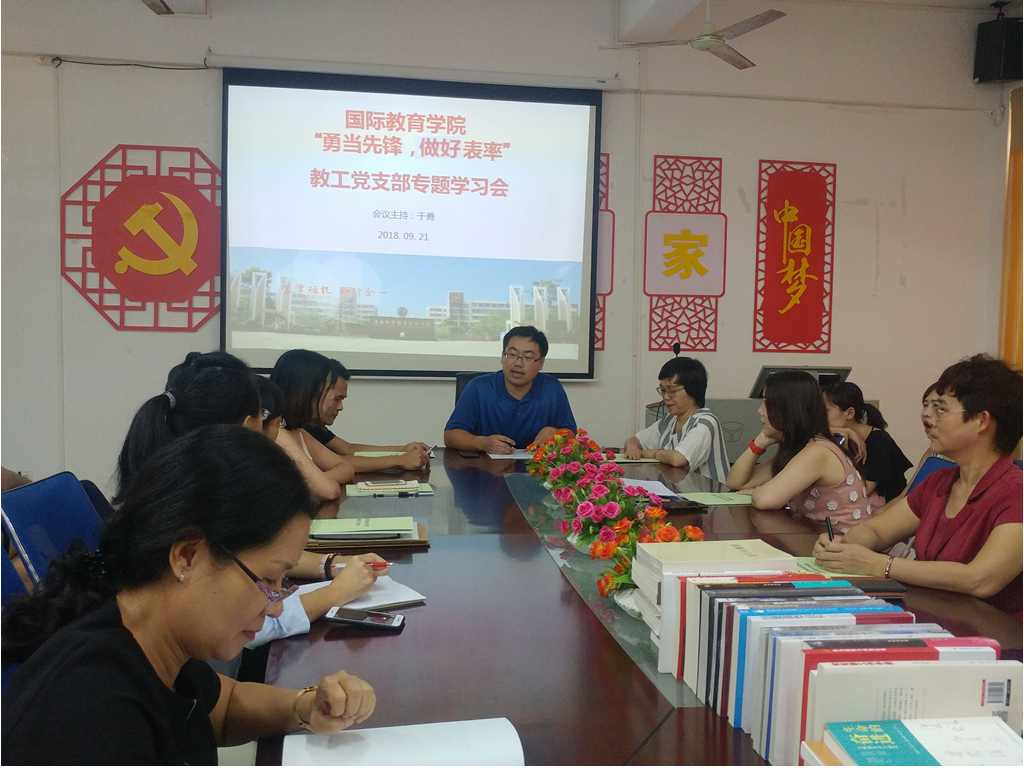2018年9月20日上午,国际教育学院全体教师开展“勇当先锋、做好表率”主题党日活动。