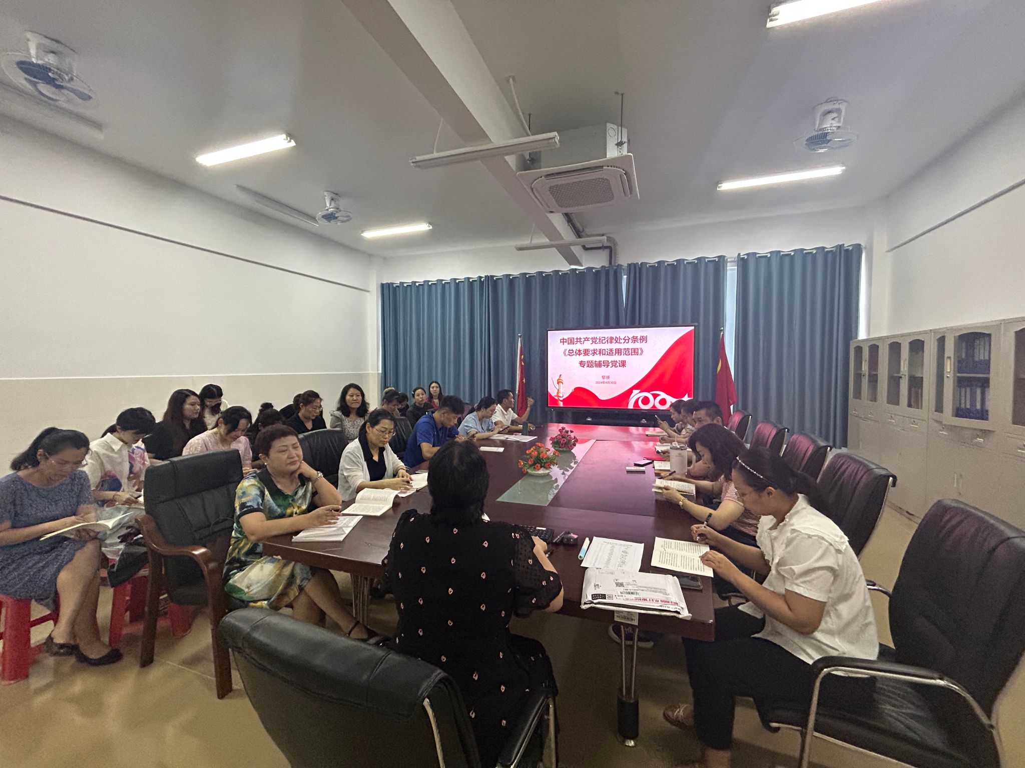 2024年4月30日下午,国际教育学院教工党支部在5-405开展了《中国共产党纪律处分条例》第一章《总体要求和适用范围》专题辅导党课。教工党支部书记黎瑛主持学习。