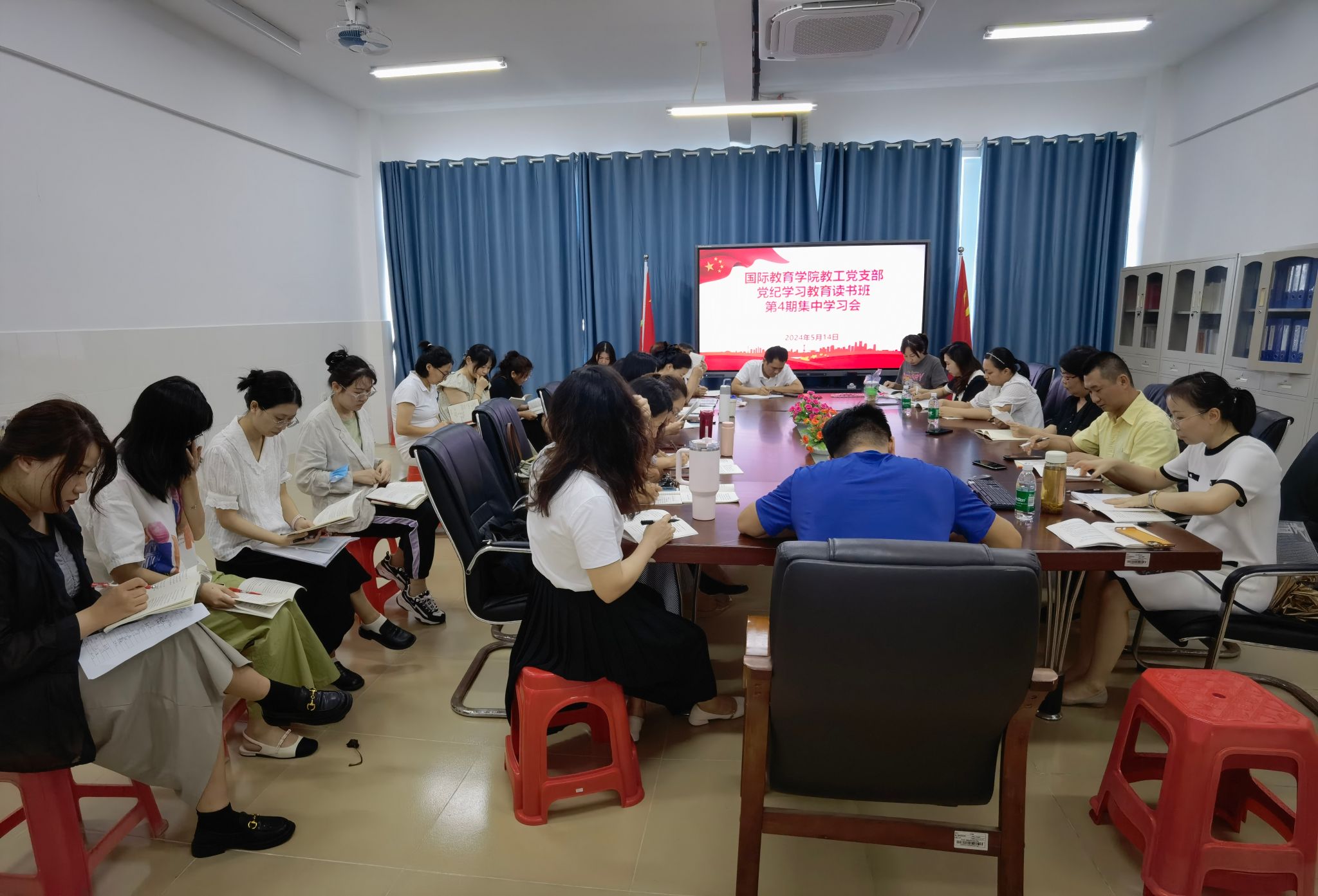 2024年5月14日下午,国际教育学院教工党支部在5-405开展了《中国共产党纪律处分条例》第四期集中学习会。支部全体党员集中学习《条例》第五章至第十 一章。