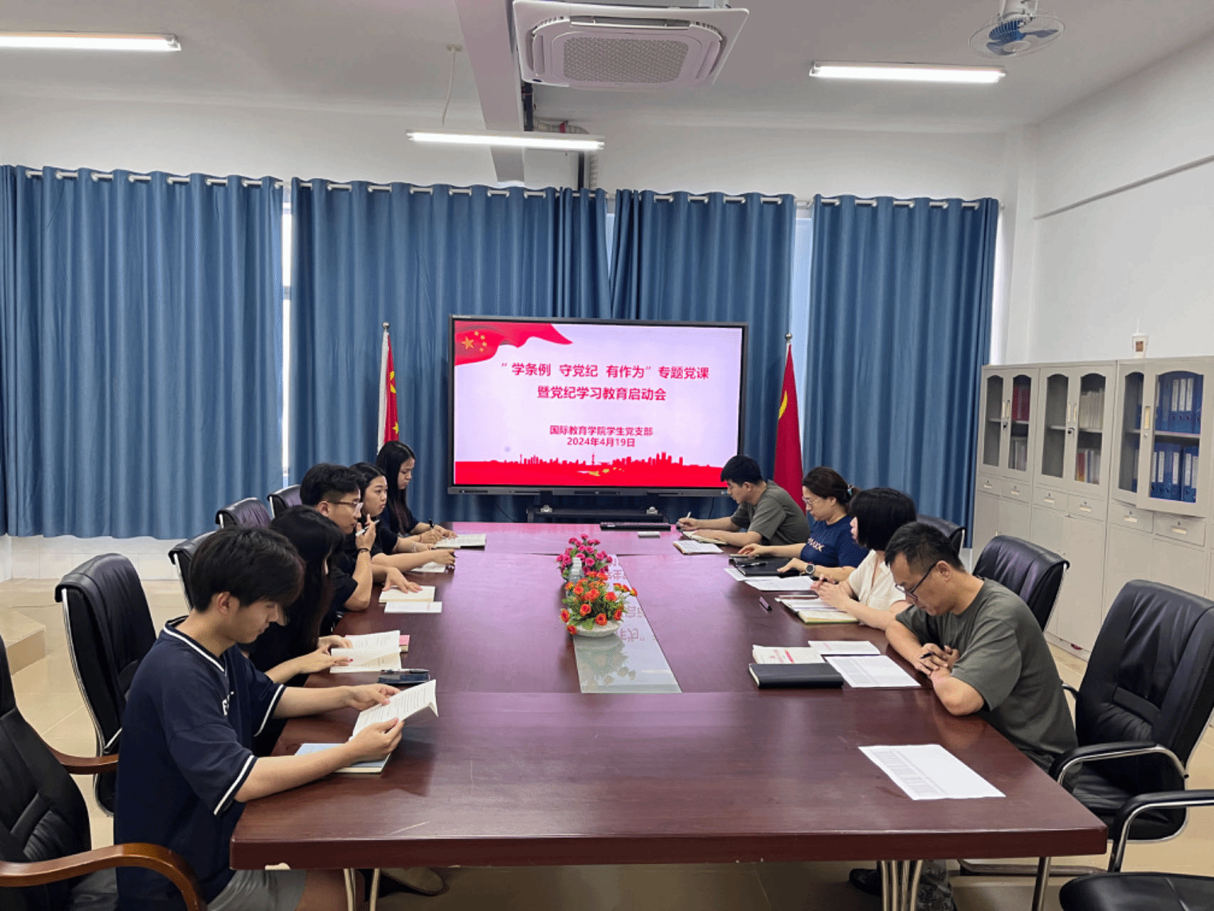2024年4月19日,国际教育学院学生党支部开展“学条例、守党纪、有作为”专题党课暨党纪学习教育启动会,支部全体在校师生党员参加会议。