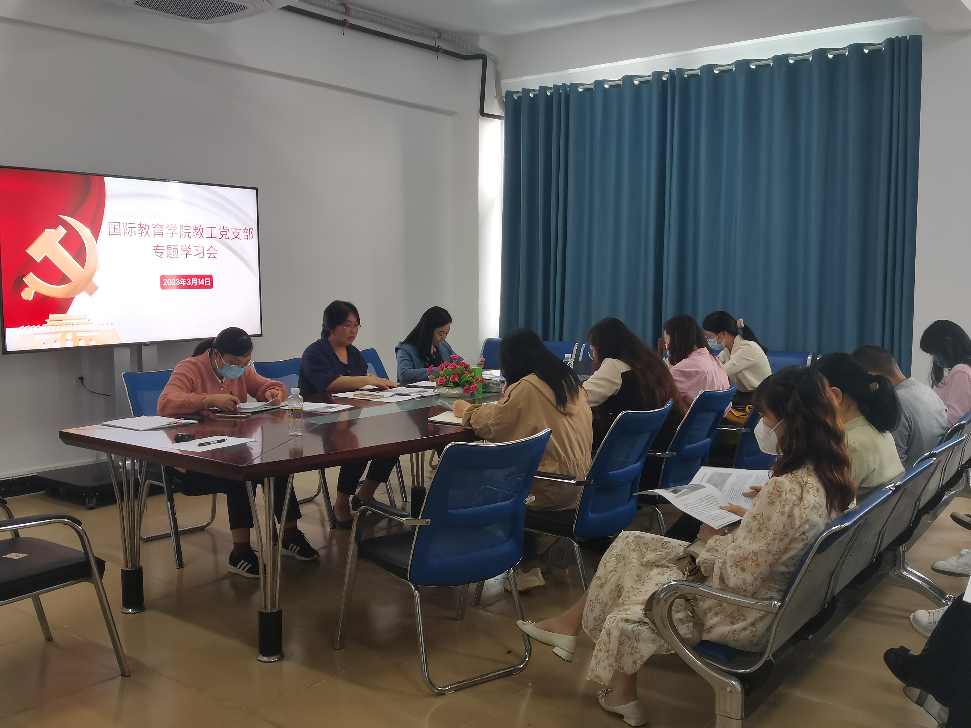 2023年3月14日,国际教育学院教工党支部在5-411组织开展了党的二十大精神专题学习会。教工党支部书记黎瑛同志主持会议,党支部全体党员参加本次学习。