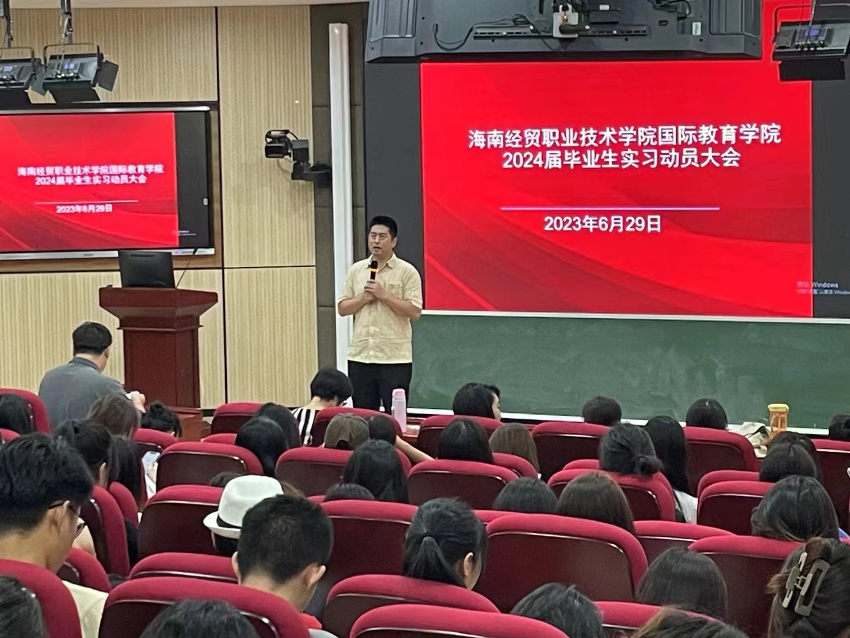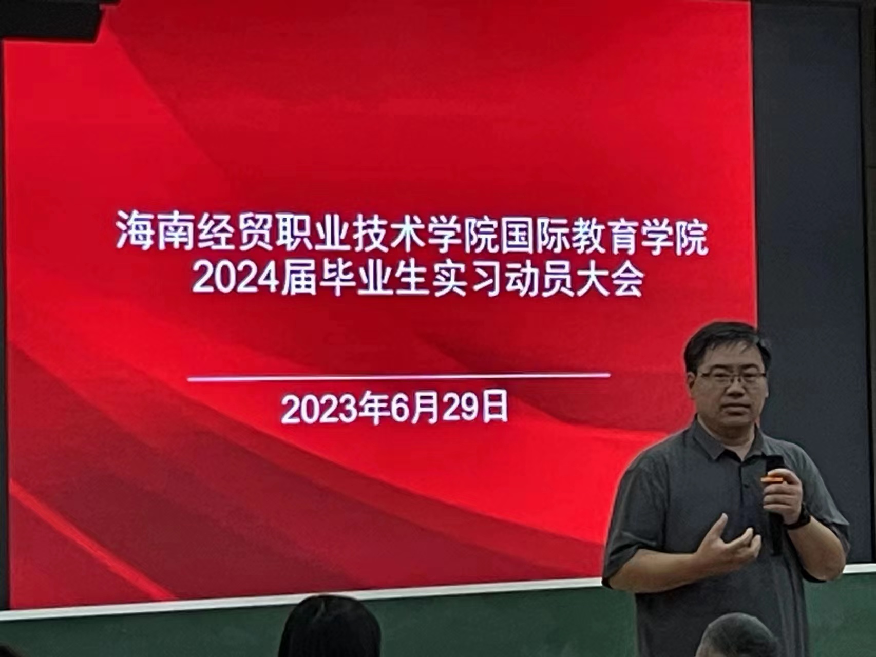 2023年6月29日,国际教育学院召开了2024届毕业生动员大会。国际教育学院领导班子、教务办、学工办、实习指导老师等参加动员大会,会议由黎瑛副院长主持。会上,韩大伟院长、于勇书记分别做了动员讲话,勉励同学们树立志向,践行梦想;积极参与实习实践,努力提升专业技能,为母校争光。