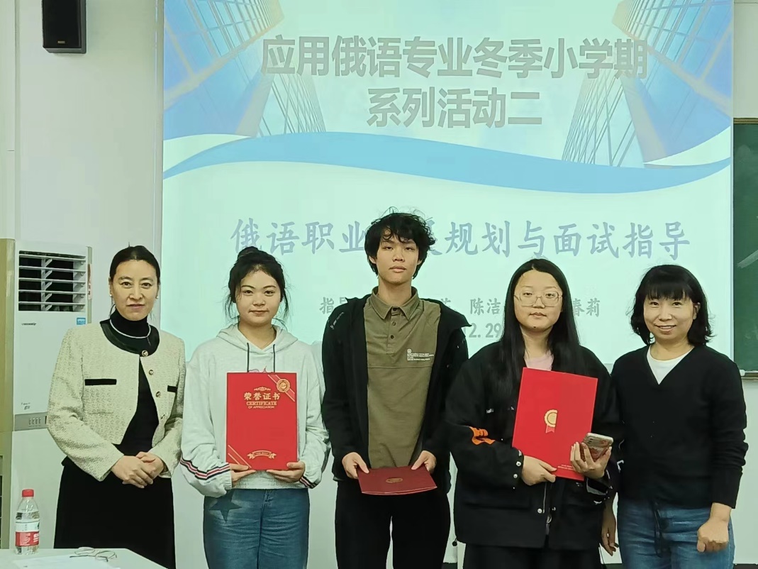 冬季小学期活动周是学校为了丰富学生的课余生活而开展的一项丰富多彩的活动。在这个系列活动中,学生们可以选择参加各种各样的课程和活动,旨在提升学生的综合素质、职业素养,培养学生的兴趣爱好。通过实际操作和亲身体验,学生们可以加深对课堂知识的理解,培养实践能力和创造力。在本次小学期活动中,应用俄语专业开展了“俄语职业发展规划与面试指导”课程,并邀请到了海南兴旺实业副总经理张悦茹为学生们做俄语职业发展规划指导。 活动第一部分,由张悦茹副总经理为同学们分享俄语专业职业经验,她从俄语职业领域出发,为学生们带来了最新俄语从业资讯,并以就业现状为切入点,深度剖析俄语职业优劣势,指导学生职业选择路径。最后张经理根据职业需求落实到对学生们的能力要求,给学生们提供了非常具体的学习目标,并殷切教导学生,在学习过程中要设定具体可行的学习计划并为之不断奋斗,这样才能练就一身本领,成为高层次人才。 随后,由应用俄语专业负责人陈洁千子讲解简历制作技巧:制作简历一定要从面试岗位要求出发,做到精炼信息,逻辑严密,简洁描述,内容详实。同时,她还分享了一系列简历美化资源供同学们使用。 第三部分是同学们现场制作个人简历并参加模拟面试,由23级班主任、张经理和陈洁千子模拟面试官提问。同学们在面试中做到了不卑不亢,沉稳答题,自信大方,给几位模拟面试官留下了深刻印象。最后,在这场激烈的角逐中,23级曾维泰、王吉祥,22级周余、郑嘉盈同学因优异表现获得“面试之星”称号。 冬季小学期活动周是一次有意义且丰富的学习和体验实践的机会。通过参加各种课程和活动,学生们不仅提高了自己的综合素质,还培养了职业素养。这不仅有助于更好地明确学习目标,还有助于更好地适应未来的职场生活。虽然活动周已经结束,但希望同学们继续保持积极的学习态度和探索精神,在实践中不断提升自己,追求更高的境界和成就。 应用俄语专业教研室 2023年12月29日