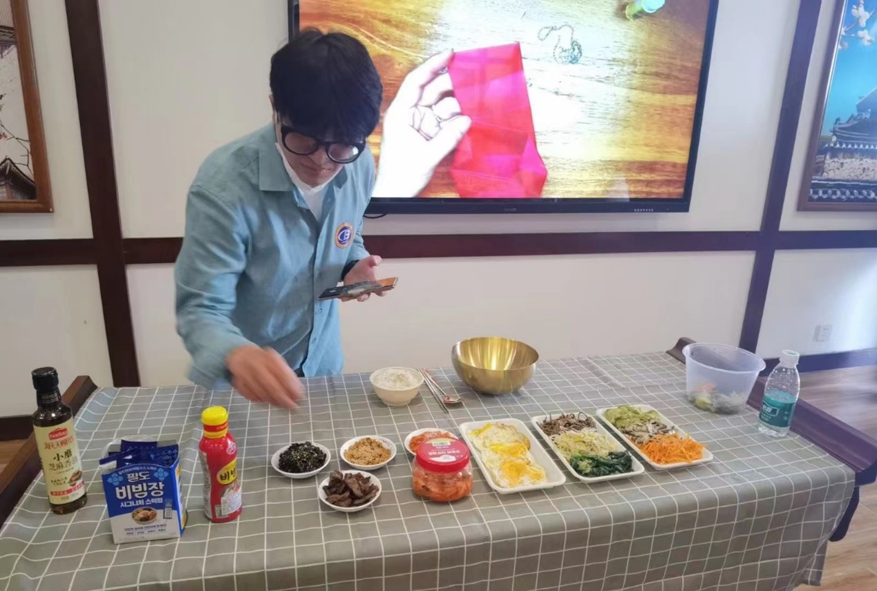 接着,韩语外教李权昶老师向同学们演示了韩国传统饮食——韩式拌饭的制作过程,金相玉老师和路冉老师在旁协助。拌饭制作活动将现场氛围拉到了高潮,全体同学参与度空前高涨,每个人都努力制作出色香味俱全、充满了韩国风情的拌饭,相互品鉴,不亦乐乎。