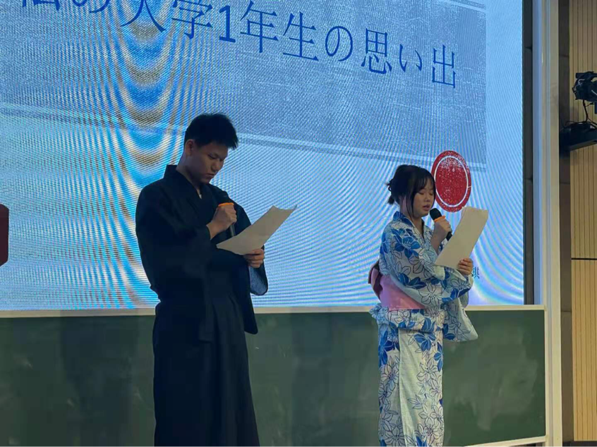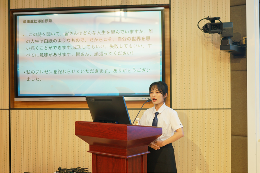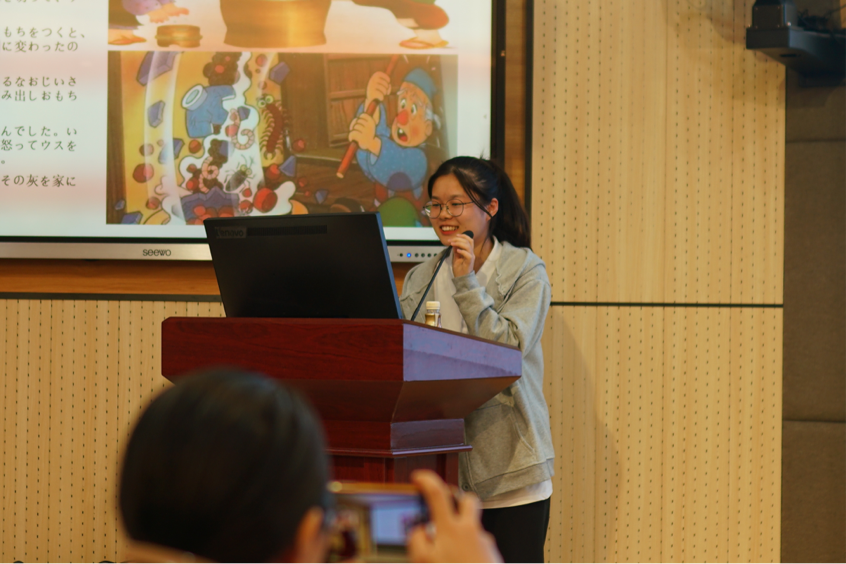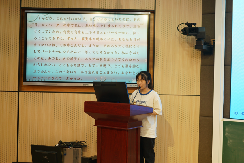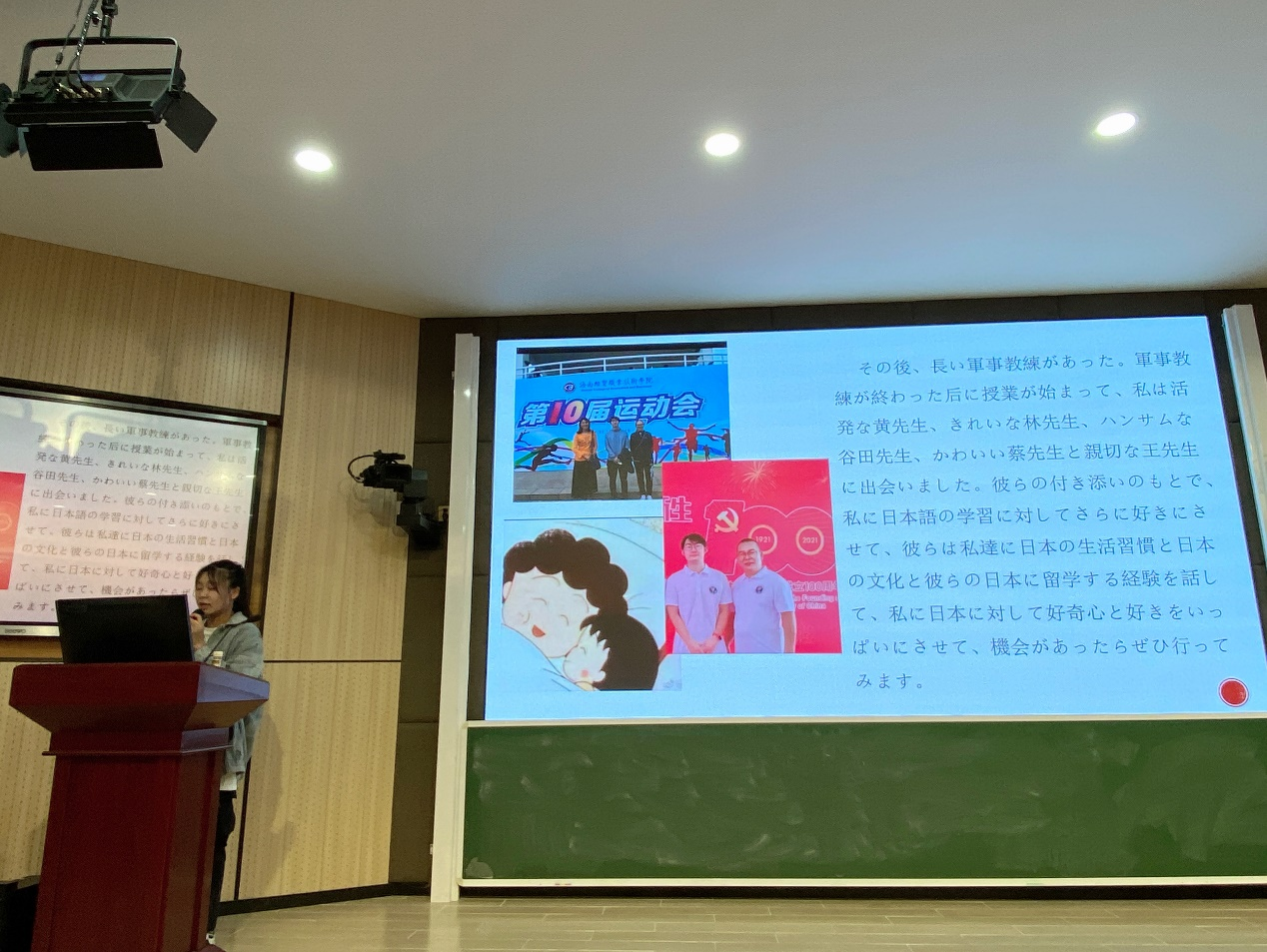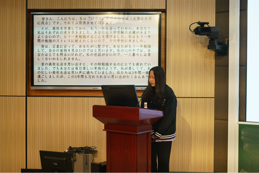 杨晓芸的《花咲おじさん》(开花爷爷),用通俗易懂的故事讲述了爷爷与他的小花园的故事,并让在座的同学们身临其境,再次感受到了亲情的美好。李秋君的《オリンピックの優勝者は张雨霏です》(奥运冠军张雨霏)讲述的是冠军张雨霏的励志故事。李瑞琪的《私の大学1年生の思い出》(我的大一回忆),讲述了她大一一年的生活经历和一些趣事内容朴实有趣风格幽默诙谐。