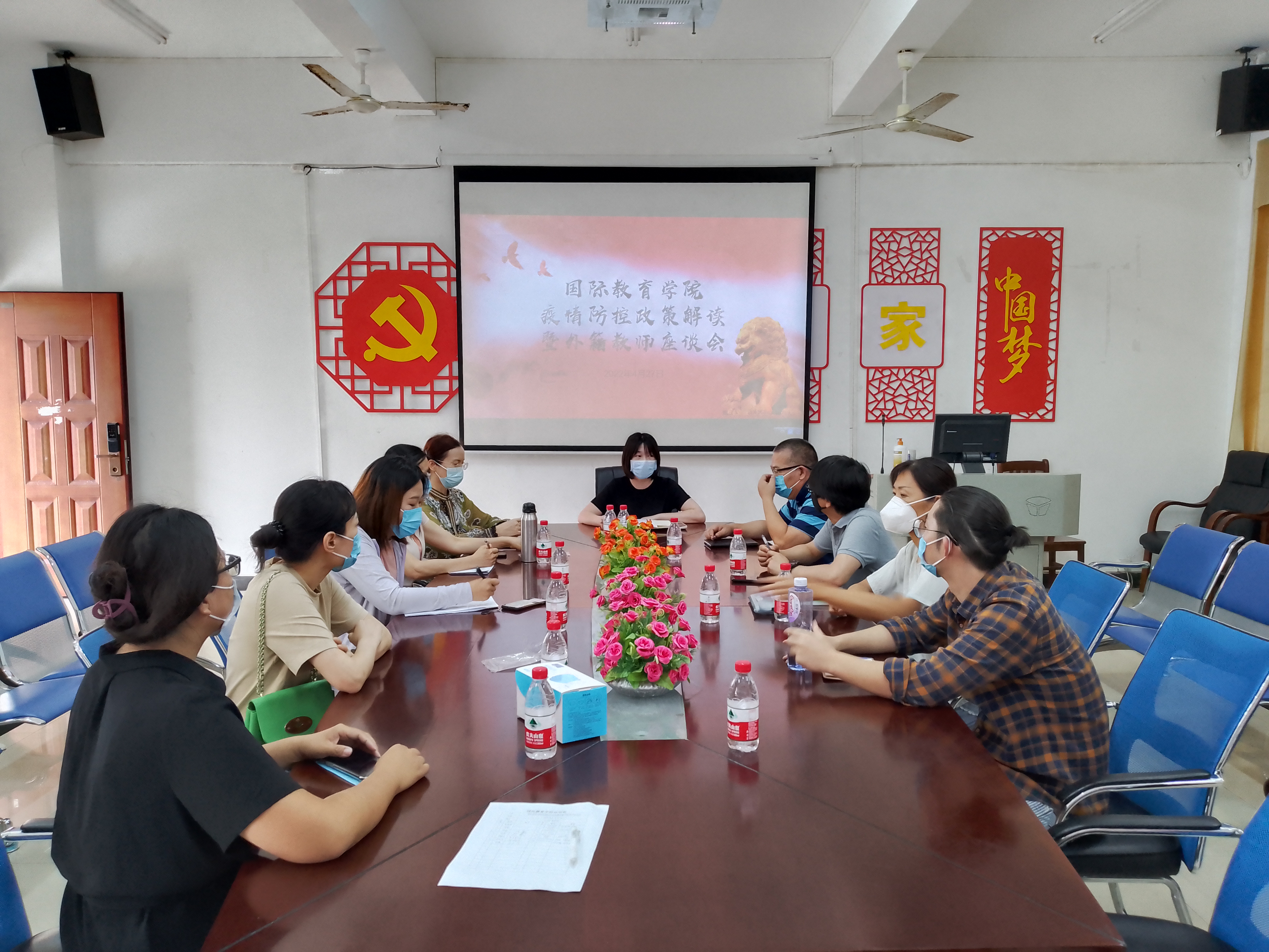 4月27日中午11点40分,国际教育学院在1-323会议室召开疫情防控政策解读籍外籍教师座谈会。各专业负责人及全体外籍教师参加本次会议,党总支副书记郑艳主持会议。