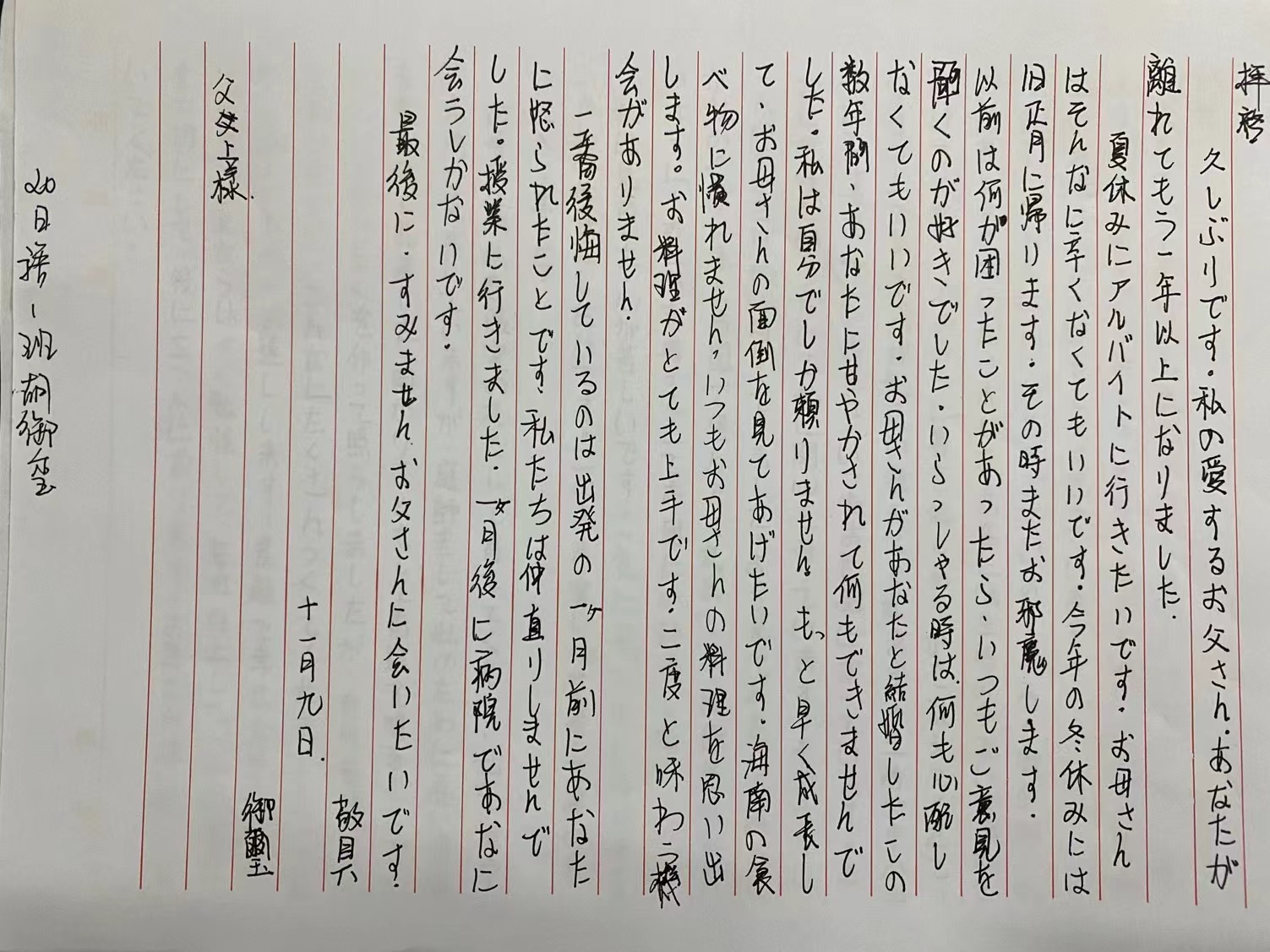 为了营造良好的日语学习氛围,进一步提高学生的日语应用能力,使学生获得良好的日语写作体验,2021年11月,举办了beat365首届日语写作大赛。本次日语写作大赛的作文标题是:《......への手紙》(给家人或朋友的一封信)。字数为200—300字。本次写作要求必须用日文标准的书信格式书写。内容必须要言之有物,有真情实感。