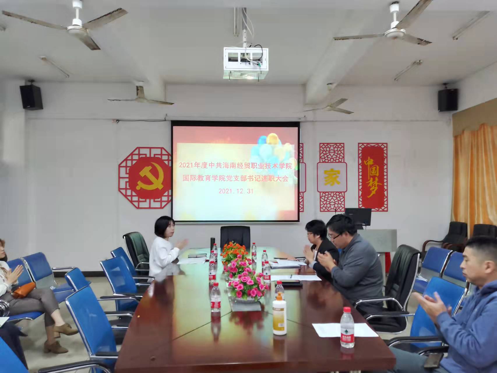 2021年12月31日上午10点,国际教育学院党总支在1-323会议室开展了2021年度基层党支部书记述职大会。教工党支部书记黎瑛同志和学生党支部书记郑艳同志分别作了述职报告,国际教育学院党员(含预备党员)参加了本次会议。