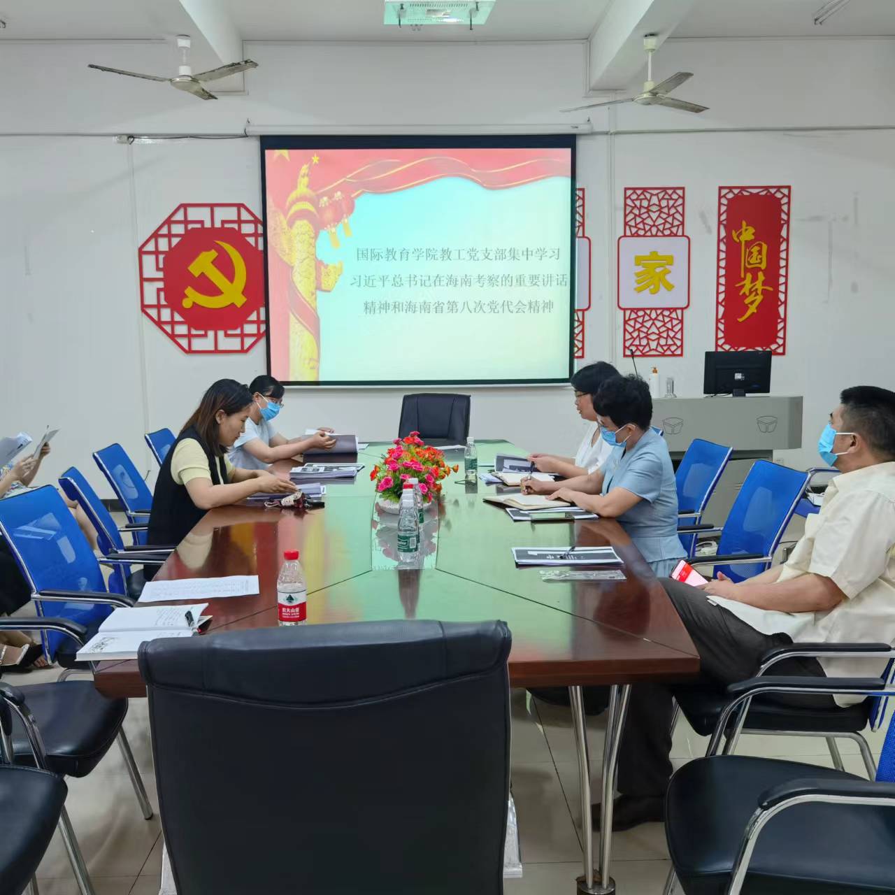 2022年5月24日下午,国际教育学院教工党支部在1-323集中学习习近平总书记在海南考察的重要讲话精神和海南省第八次党代会精神。全体教工党员参加会议。教工党支部黎瑛书记主持会议。
