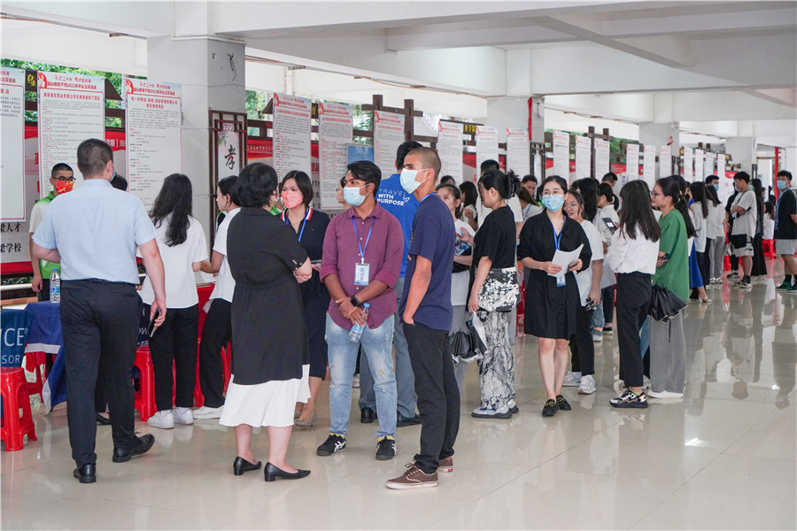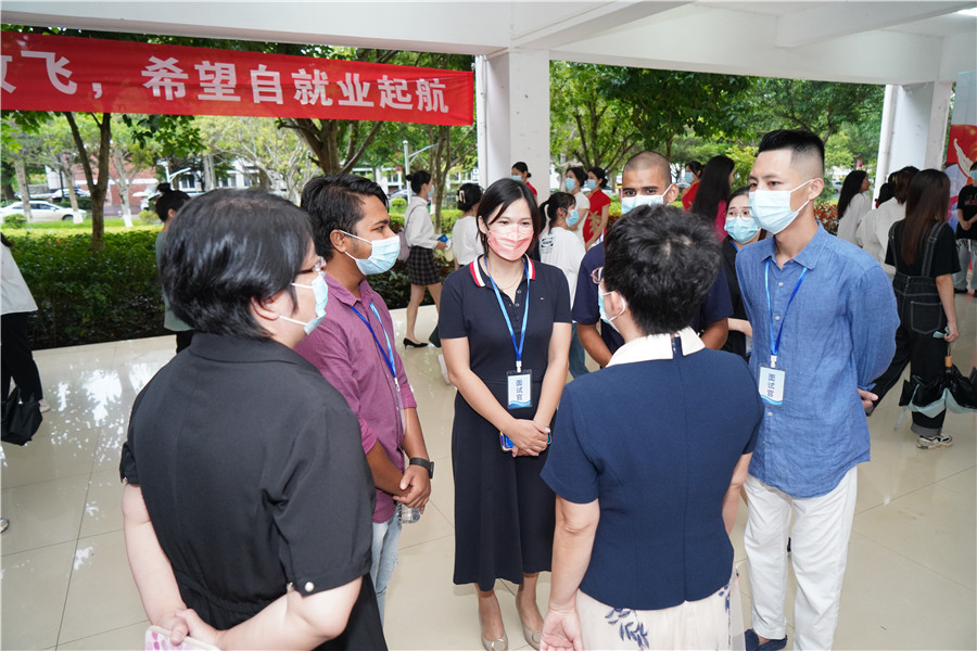 5月31日下午,国际教育学院2022年毕业生双选会在第一教学楼一楼大厅举办。22家省内企业参加招聘,共提供500余个就业岗位,涉及酒店、贸易、信息、教育等多个行业领域,近400名中外毕业生参加应聘。