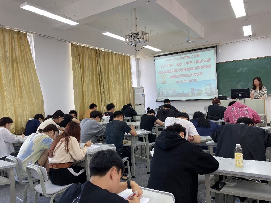 为了丰富学生的日语学习生活,调动日语的学习兴趣和热情,培养其阅读翻译的耐心、技巧及表达能力,2023年3月7日,国际教育学院在第一教学楼609教室举办了“CATTI杯”全国(中日)翻译大赛暨海南省大学生翻译比赛预选赛。赛前,各位日语专业教师积极动员、精心组织,共有来自应用日语专业2020级、2021级、2022级的41名学生参加。赛场中,选手们沉着冷静,认真答题,展现日语翻译才华。陈小苗老师作为本次比赛的指导教师全程带领学生参加。黄金玉老师从旁协助指导。