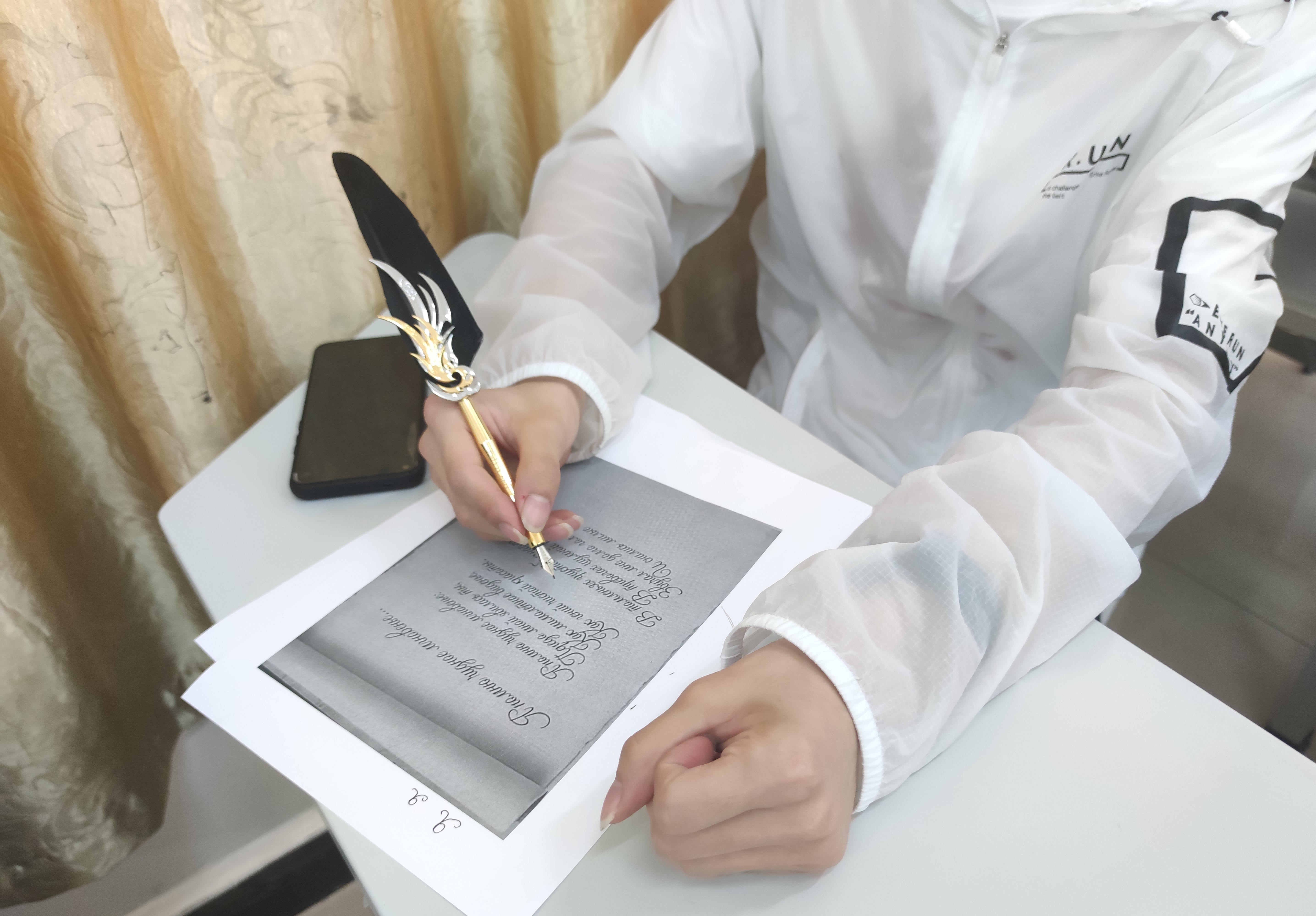 比赛流程主要有:公布比赛规则及比赛诗目、正式书写、评委评分、颁发奖品。在比赛环节,各参赛同学专注认真、全神贯注,不仅展示了书写的良好姿态,更完美体现了海经贸学生优秀的精神风貌。比赛时学生使用经典羽毛笔,将俄式书写习惯融入写作过程。他们洋洋洒洒、奋笔疾书,用清秀的字迹赢得了俄语教研室教师的一致赞赏,同时也将“书我之感,写其精神”的书法精神根植在心中。