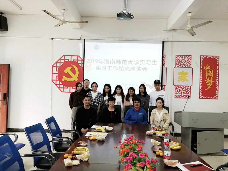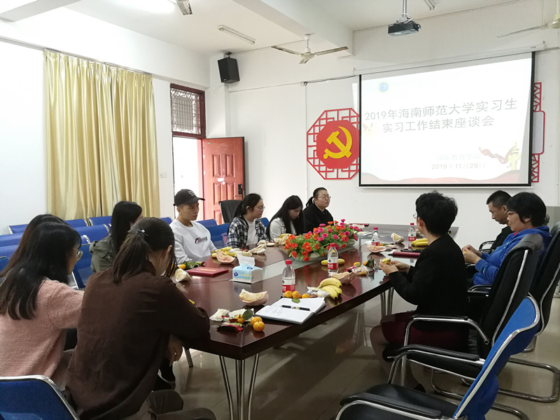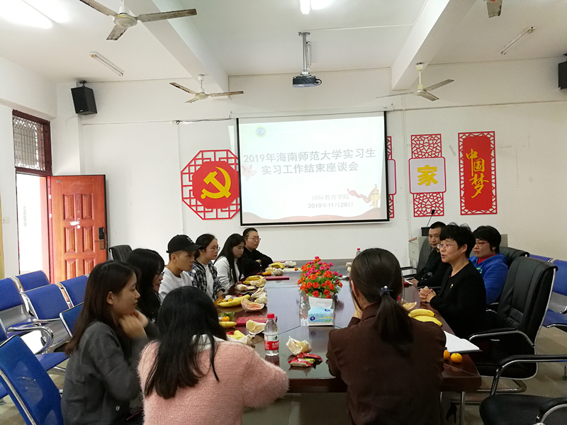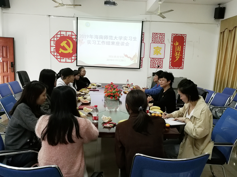 2019年11月29日上午11:30,海南师范大学国际教育学院实习生实习工作结束座谈会在我院会议室323顺利开展,参加会议的人员有我院院长张春玲、副院长黎瑛、教学办主任林仕昌、国际汉语教师侯萌及8位实习生。