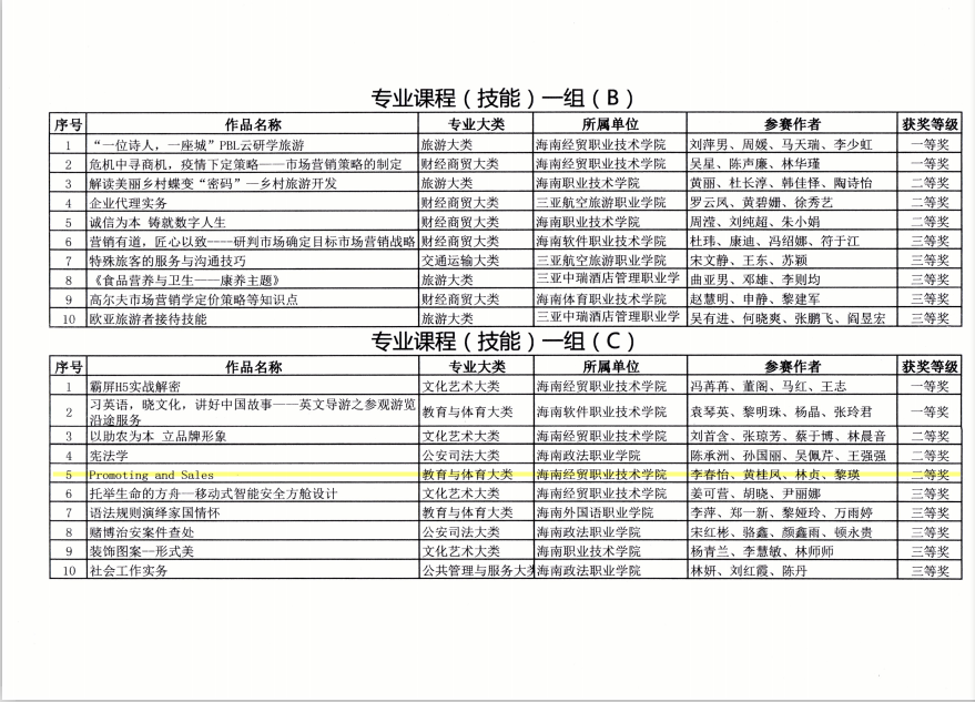 为积极提高自身教学技能和信息技术素养,推动信息技术与教育教学深度融合,2020年8月29日,我院李春怡、黄桂凤、林贞、黎瑛等四位教师积极参与海南省2020年高等职业院校技能大赛教学能力比赛,并以参赛作品《Promoting and Sales》荣获专业课程(技能)一组二等奖,为校争光!