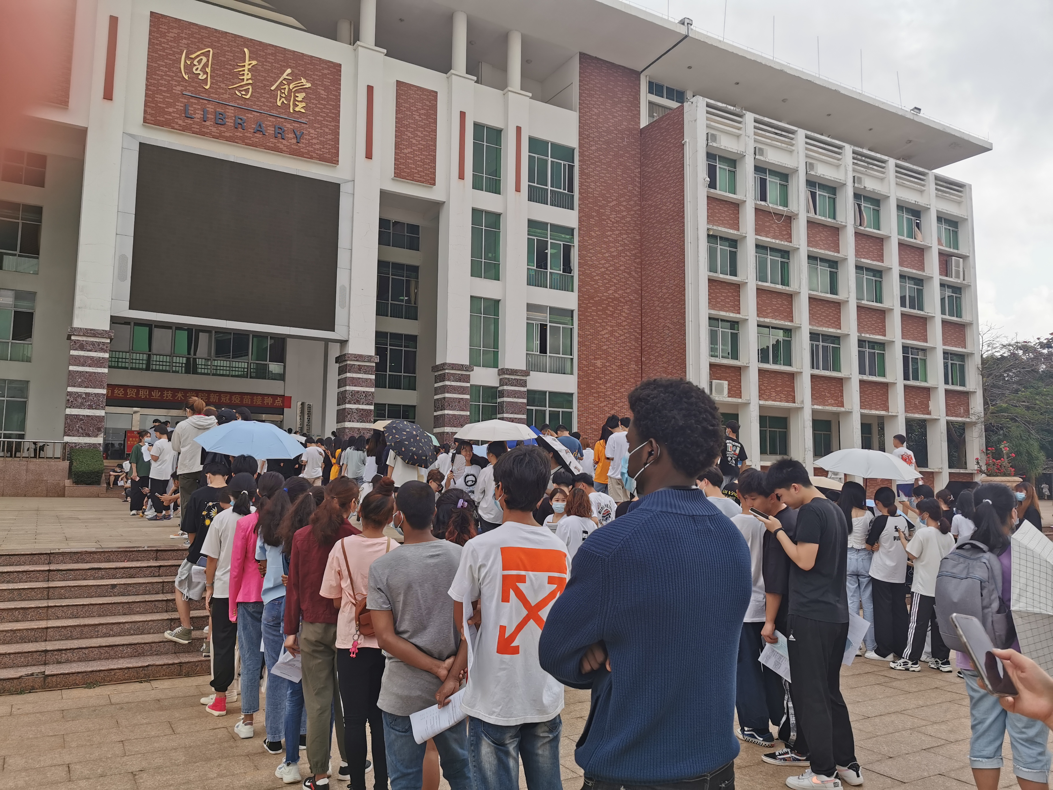 国际教育学院党总支书记于勇前往校图书馆疫苗接种现场,关心同学们的疫苗接种情况,并带头接种。国际教育学院中外师生积极踊跃地响应号召,早早地到图书馆门口排队,接种。疫苗接种现场,同学们穿着宽松衣服,佩戴口罩,携带相关证件有序排队,并听从工作人员的指挥,很好地配合了志愿者以及医护人员的工作,保证接种疫苗顺利进行,现场各个环节有条不紊地推进。尼泊尔的留学生们为能够在学校免费接种新冠疫苗对我们的国家表示感谢,因为在他们的国家新冠疫苗接种不是免费的,也不是人人都可以享受到的福利,他们很开心可以留在中国学习和生活。