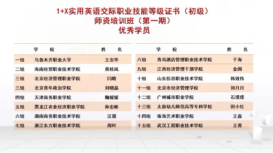 黄桂凤老师在2021年1+X实用英语交际职业技能等级证书(初级) 师资培训(第一期)被评为优秀学员