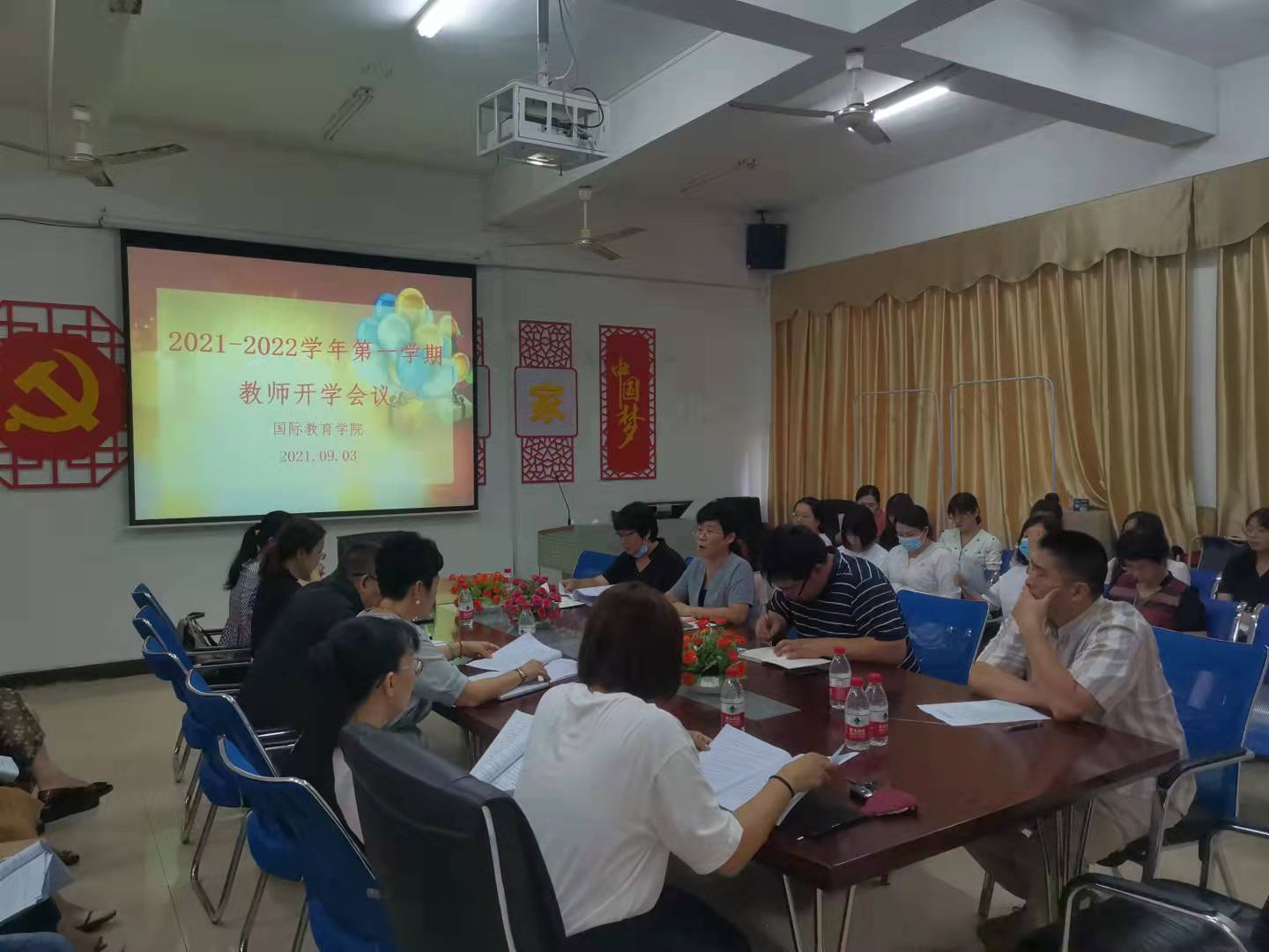 为扎实安全有序做好 2021-2022学年第一学期开学工作,9月3日上午,国际教育学院在1-323会议室召开了全体教师开学会议。国际教育学院党总支书记于勇、张春玲院长、黎瑛副院长、韩大伟副院长及全体教职工参加了此次会议。