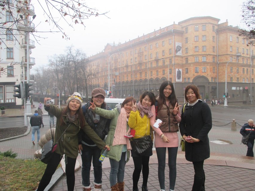 刚到明斯克的时候天还不是很冷,我们却穿着羽绒服下了飞机,着实成了一道“风景线”。出了机场看到了学长和中介姐姐,感觉又回到了大一刚入学的时候,也是学姐学长来接我们,有回忆也有感动。在去宿舍的路上我们没有了疲倦,都欣赏起车窗外明斯克金色的秋天,看到了蓝天、白云、白桦树和欧式风格小房子,呼吸着新鲜的空气感觉十分惬意。到了宿舍放下行李我们就去办了电话卡,然后学长带我们去买了些生活用品。接下来的几天就是我是熟悉环境的时间了,兰婷婷学姐带我们四处逛了下,还带我们去了教堂,我们玩的很开心。现在想想在陌生的国度有朋友在真好!