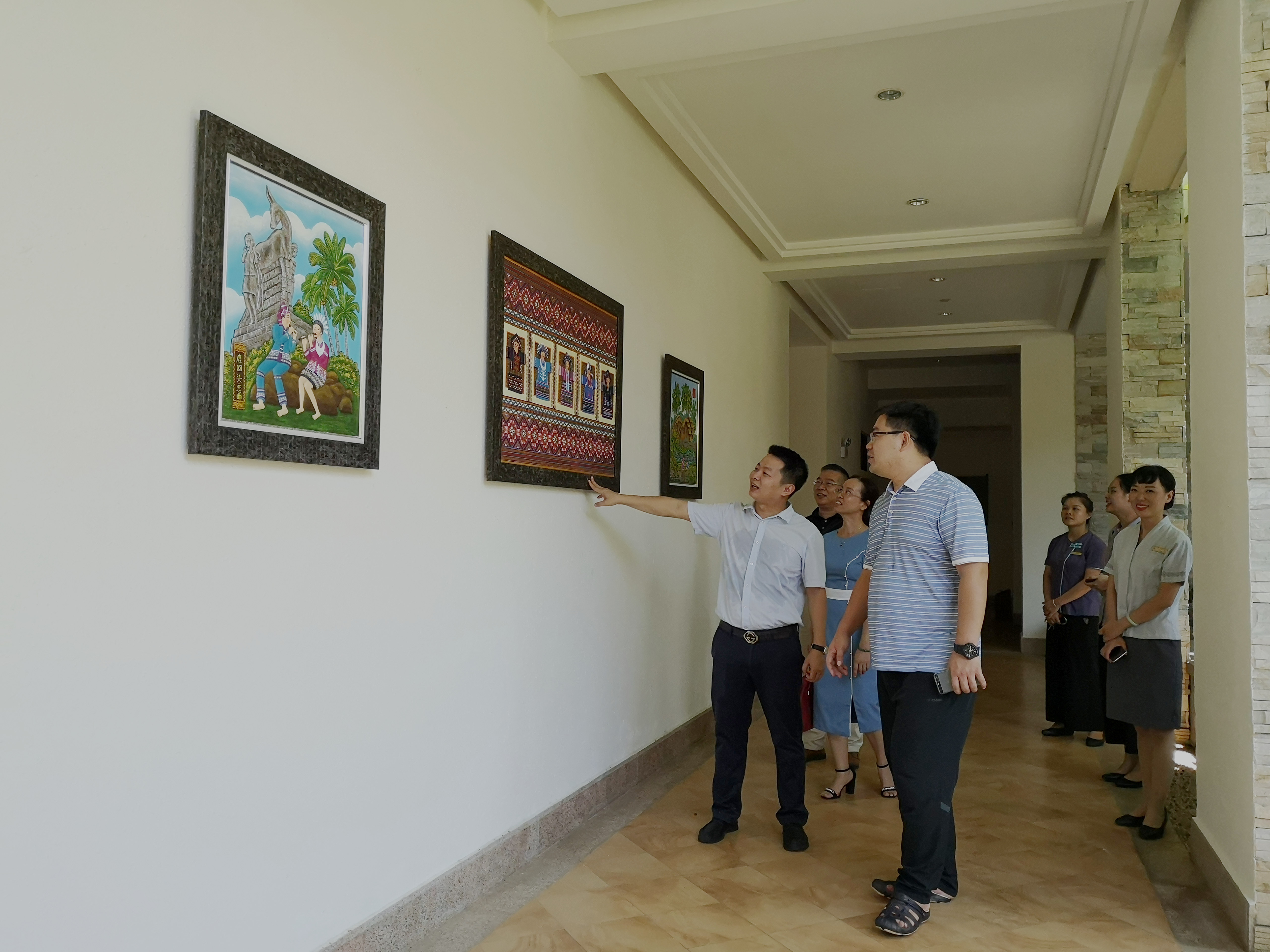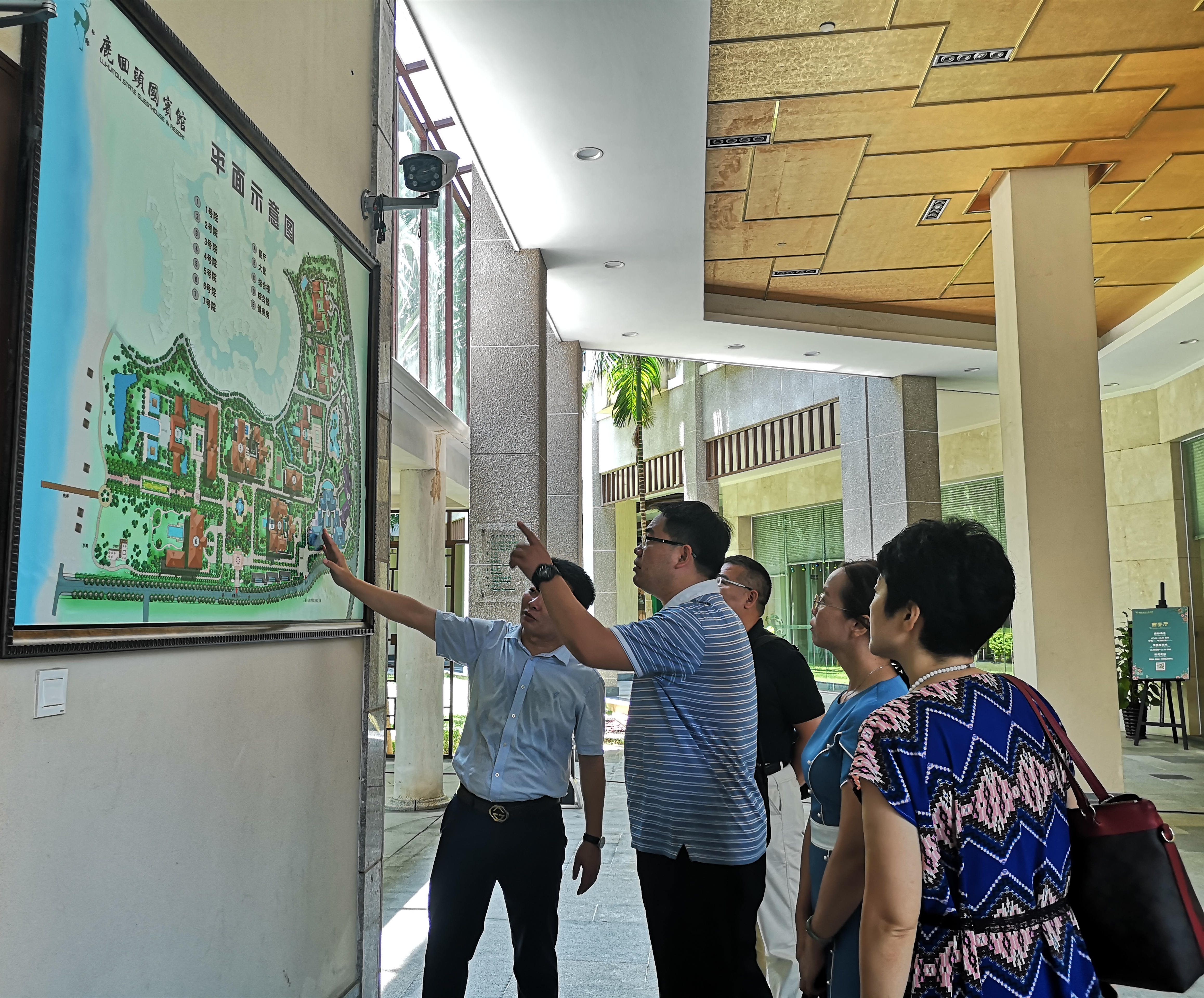 在三亚鹿回头国宾馆,龙田平主任带领我院领导及各位专业主任参观鹿回头国宾馆,并向于勇老师详细介绍国宾馆内部的区域划分、历史沿革等,于勇老师详细询问、了解有关三亚鹿回头国宾馆对相关人才需求的条件。