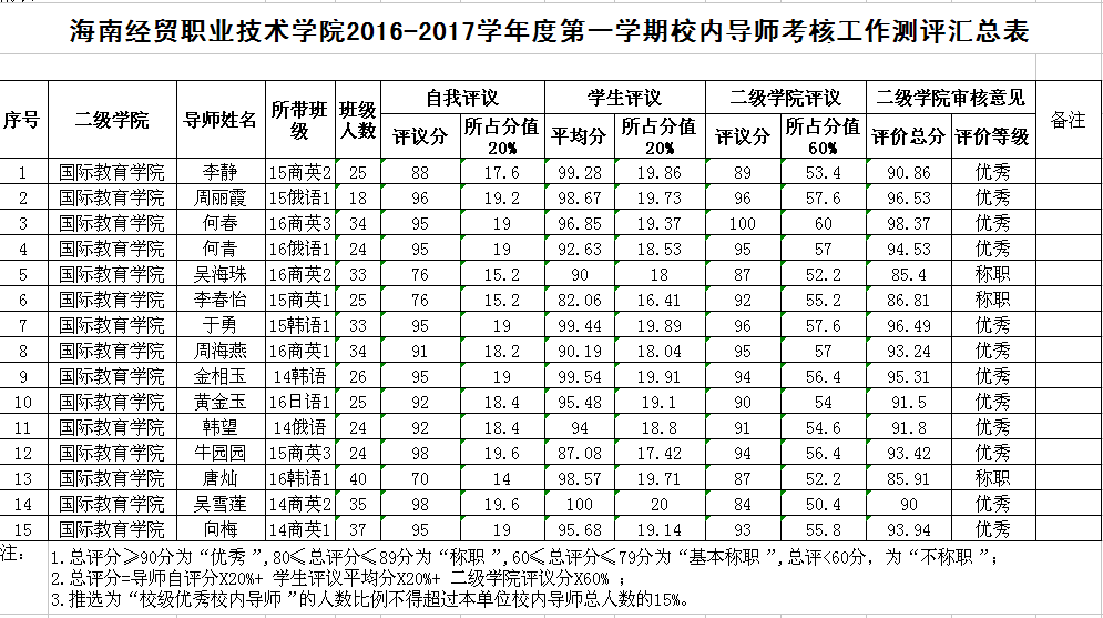 国际教育学院2016-2017学年度第一学期校内导师考核测评结果公示